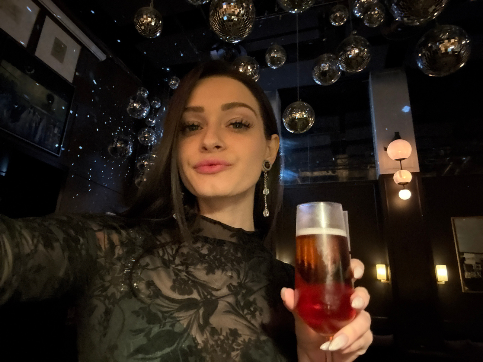 A woman is holding a cocktail in a bar, likely in Moscow, Russia. She is wearing a sheer, dark floral top and dangling earrings. The cocktail appears to be multi-layered, with red, amber, and a light-…read more