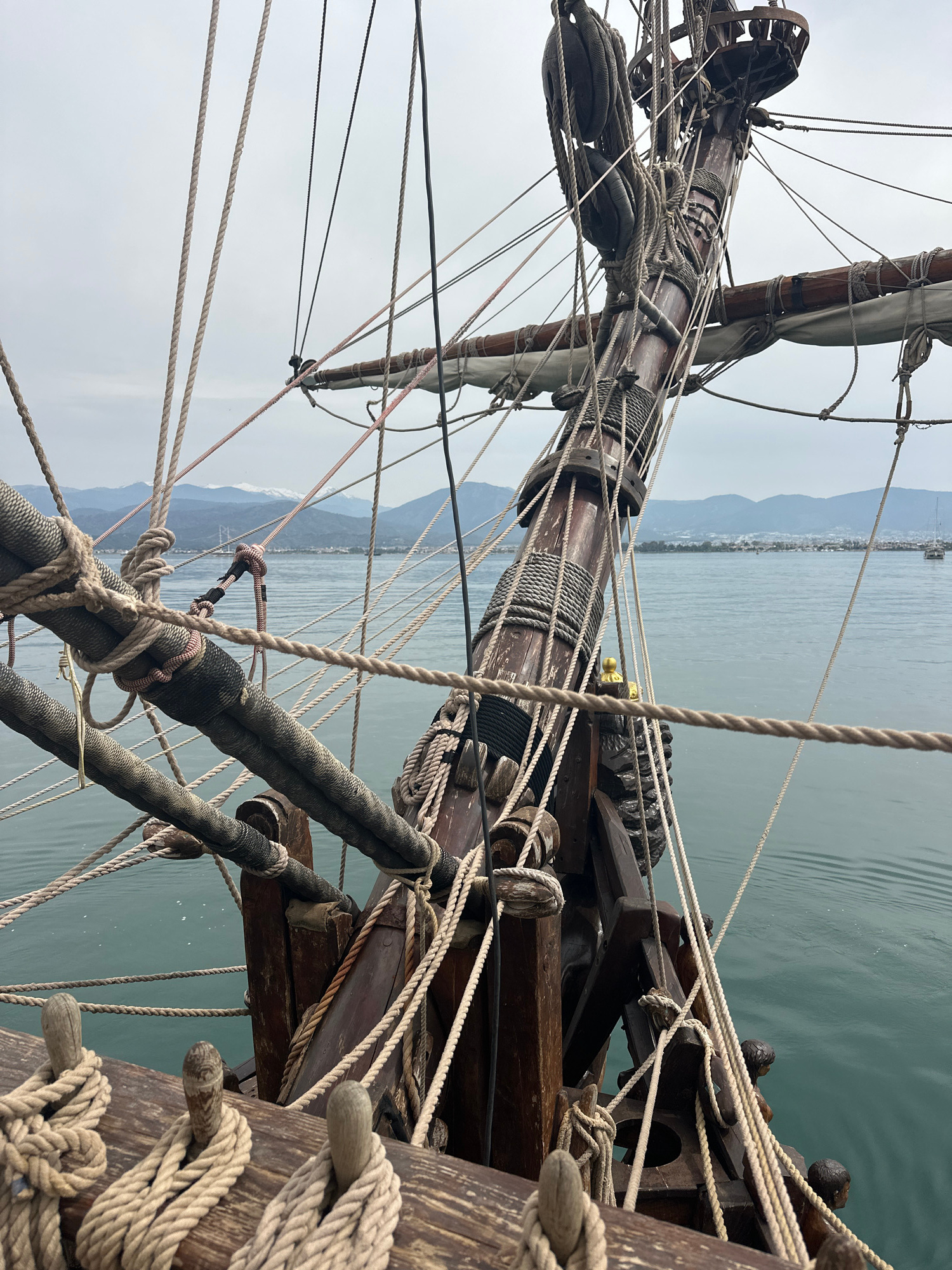 The image depicts the rigging and mast of a sailing vessel, likely a historical reproduction, with a view of Fethiye, Turkey in the background. The intricate network of ropes, blocks, and wooden spars…read more