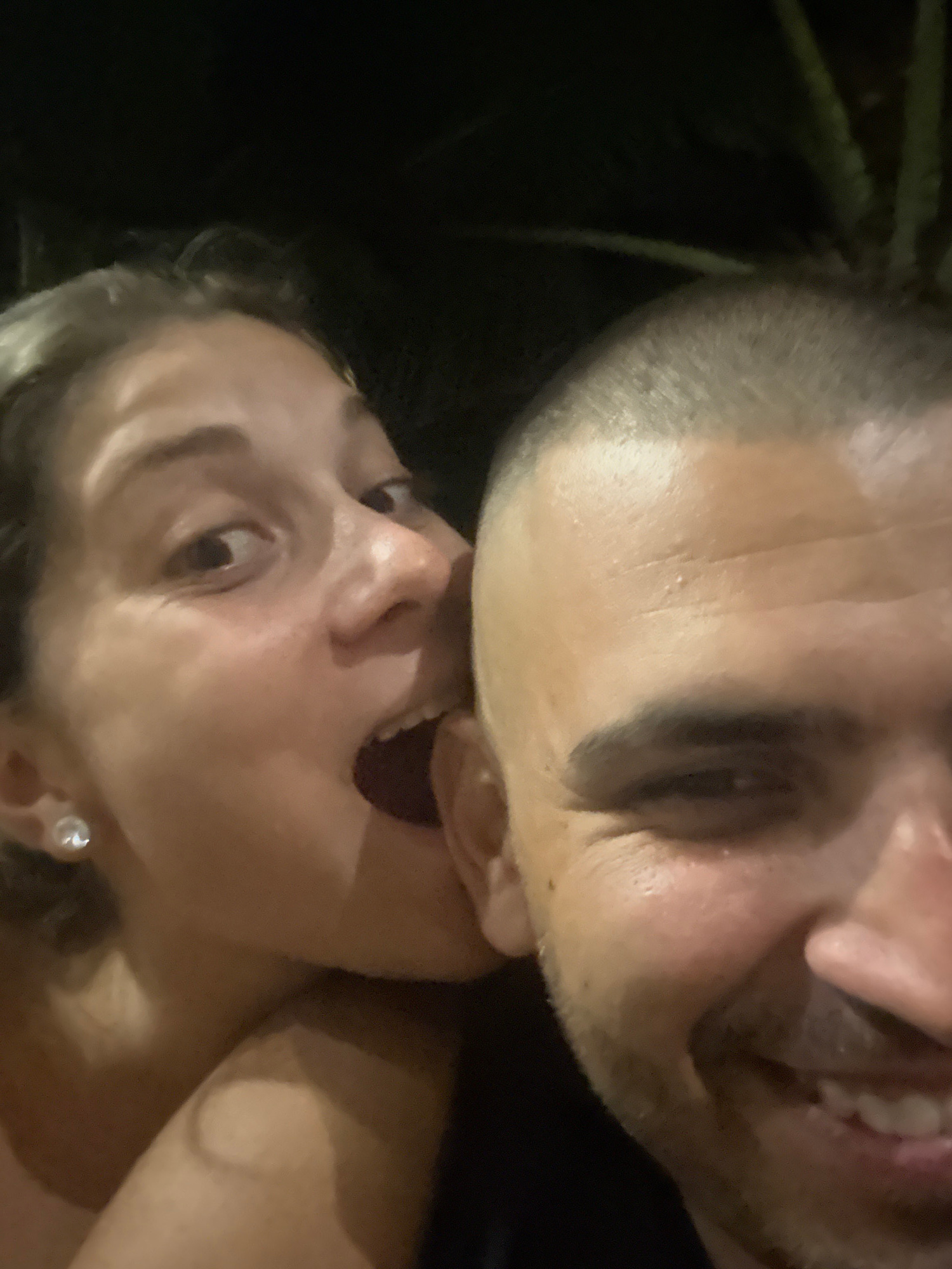 Two people are positioned close together with open mouths, appearing to be eating or acting like they are eating each other’s heads. The background is dark, with some foliage visible in the top left c…read more