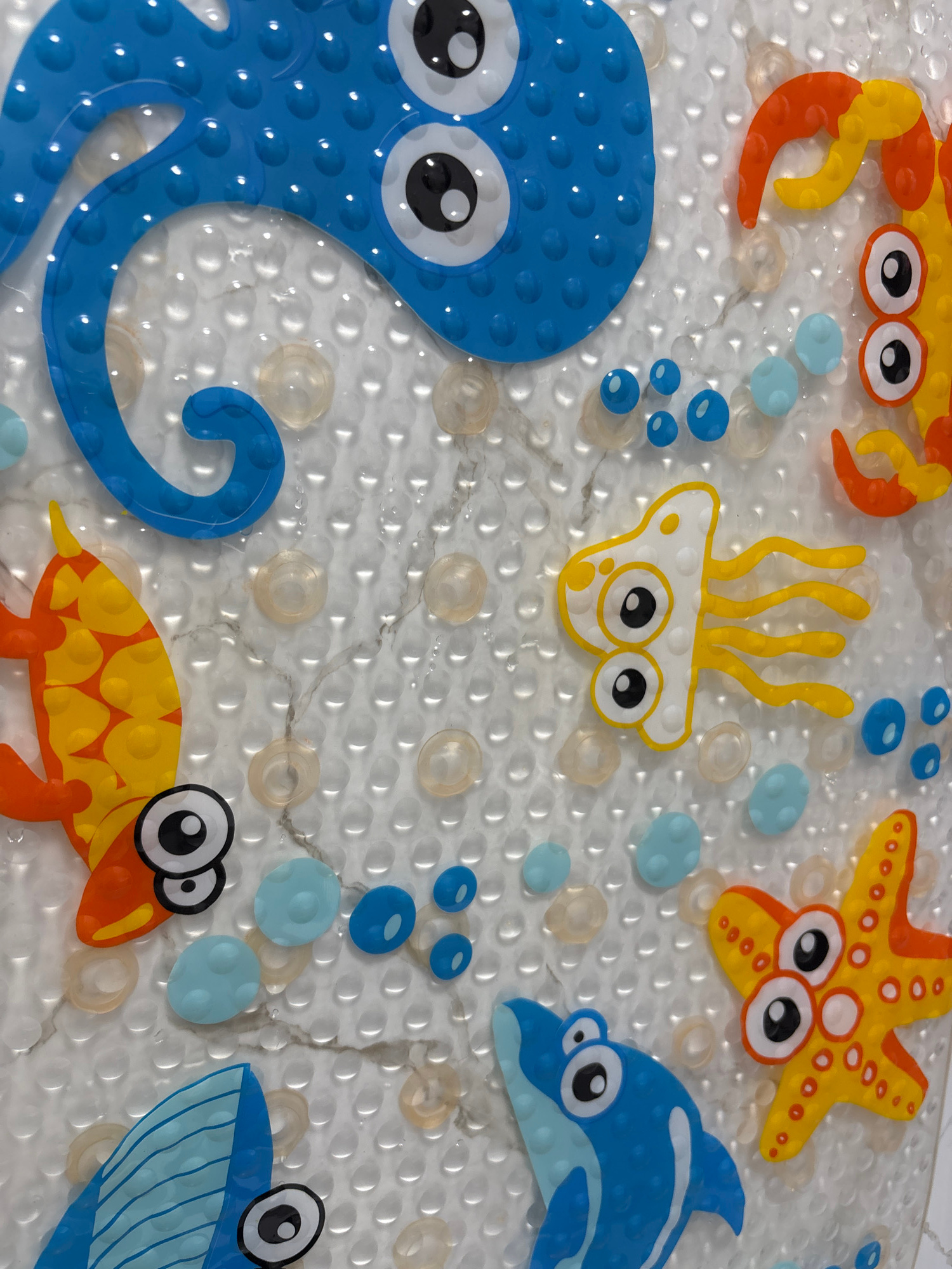 The image shows a close-up view of a non-slip bath mat decorated with cartoon sea creatures. There is a blue octopus, a yellow and orange crab, a yellow and orange starfish, a white and yellow jellyfi…read more