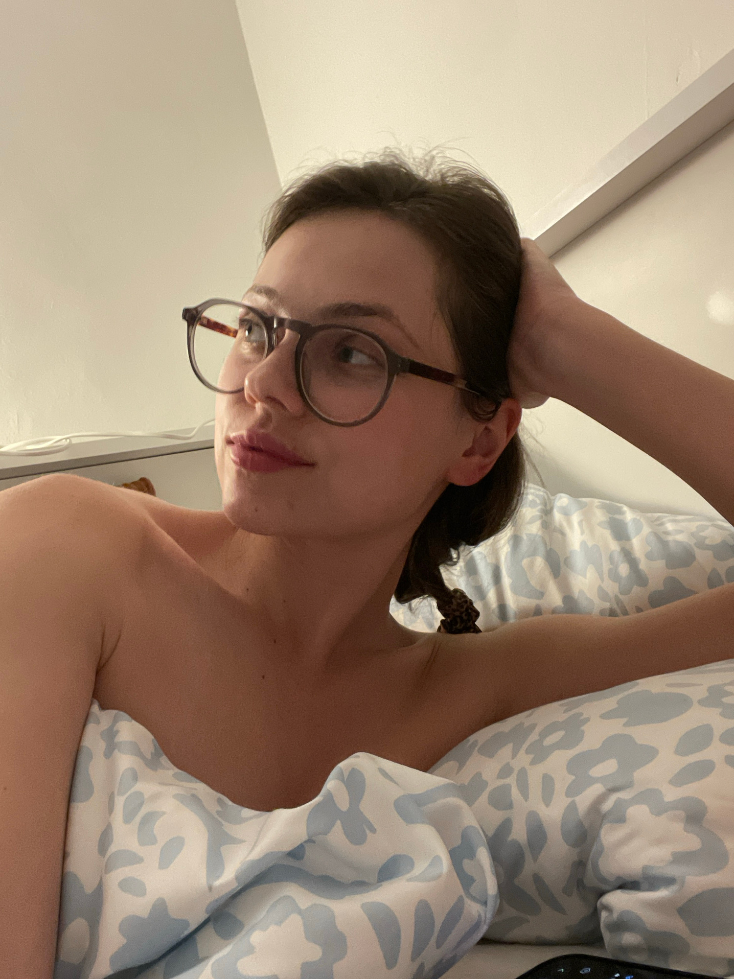 A woman with dark hair and glasses is lying in bed, covered with a blue and white patterned blanket. Her head is tilted to the side, and her arm is raised above her head. The background is a plain whi…read more