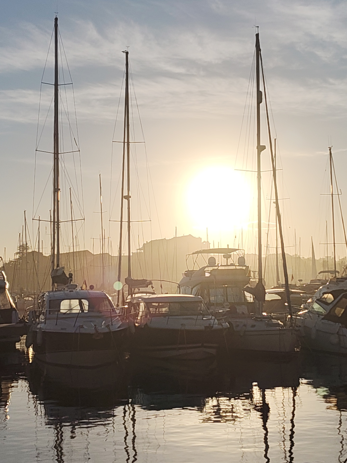The image captures a scene at the marina in Dénia, Spain, during the early morning or late afternoon, indicated by the low sun. A multitude of boats, predominantly sailboats and motor yachts, are dens…read more