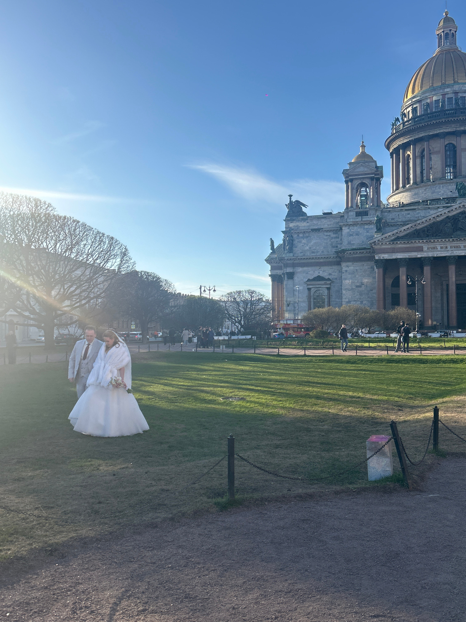 In the foreground, a bride and groom pose on the grass. The bride is wearing a white wedding dress and veil. The groom is wearing a light gray suit with a tie. They are standing near a row of trimmed…read more