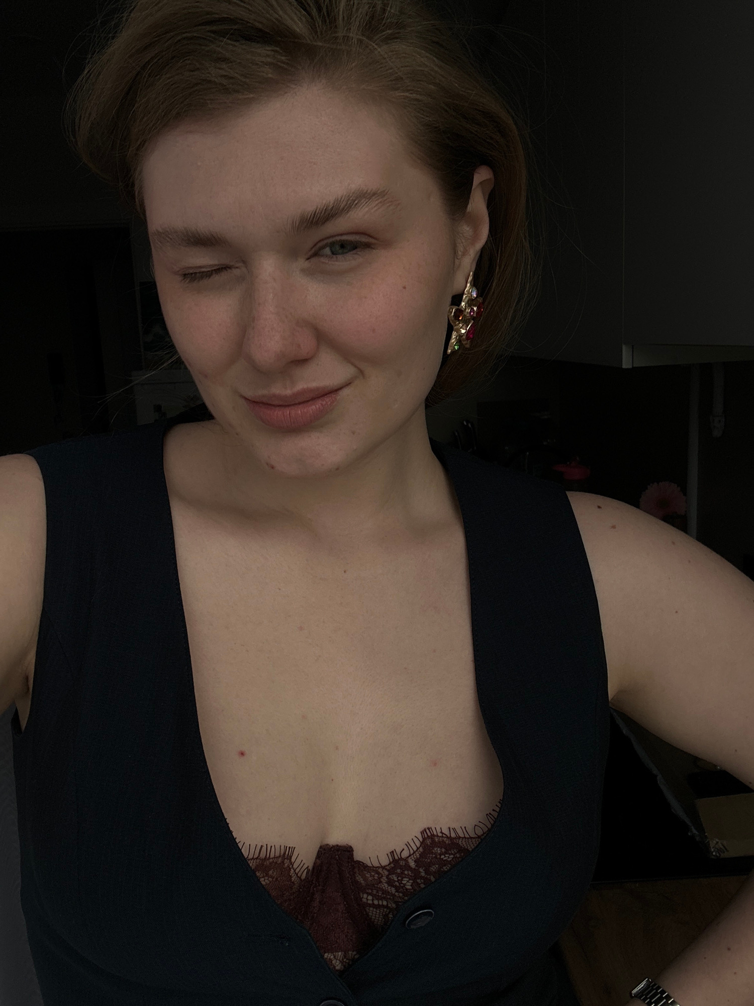 A fair-skinned woman winks at the camera. She is wearing a black garment, underneath of which is a deep red top with lace detail, and an ornate gold earring. The setting is a darkened interior with in…read more