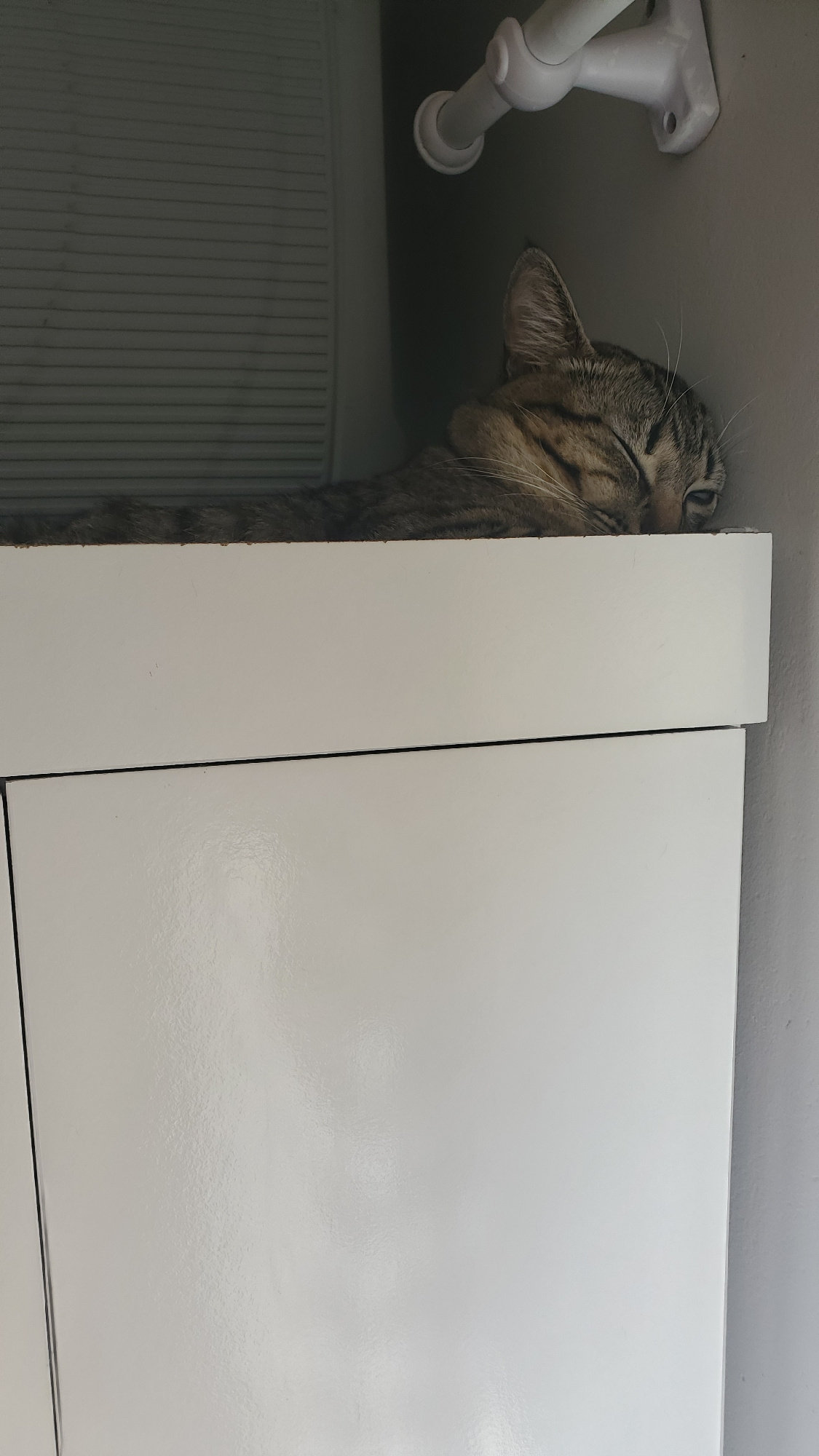 An indoor scene, set in Curitiba, Brazil, features a sleeping tabby cat. The cat, exhibiting brown, grey, and black striped fur, is resting on a white, glossy surface, which appears to be the top of a…read more