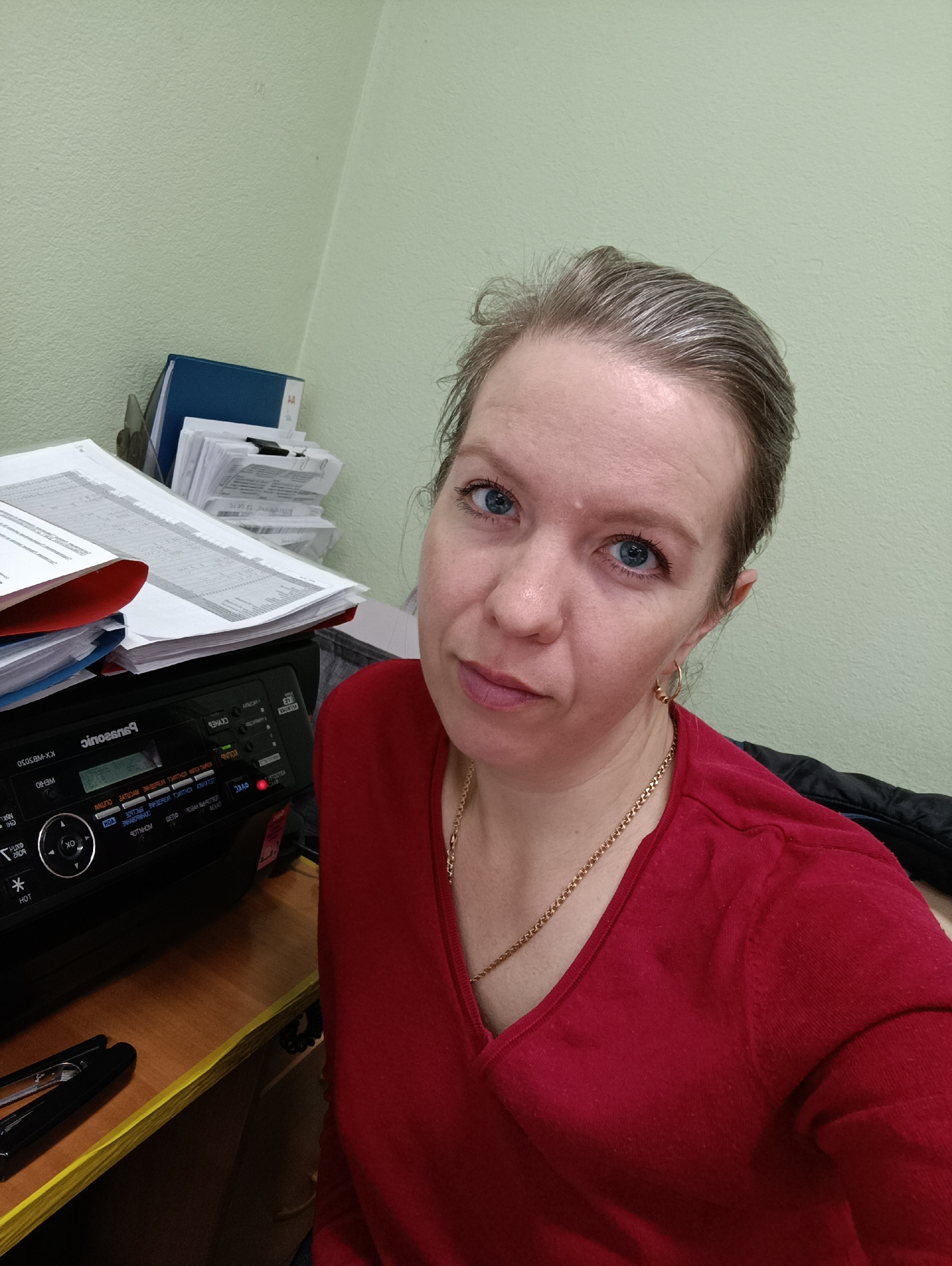 A woman with fair skin, blue eyes, and light brown and grey hair pulled back is featured in a close-up, slightly high-angle shot. She wears a red V-neck long-sleeved top, a gold chain necklace, and sm…read more