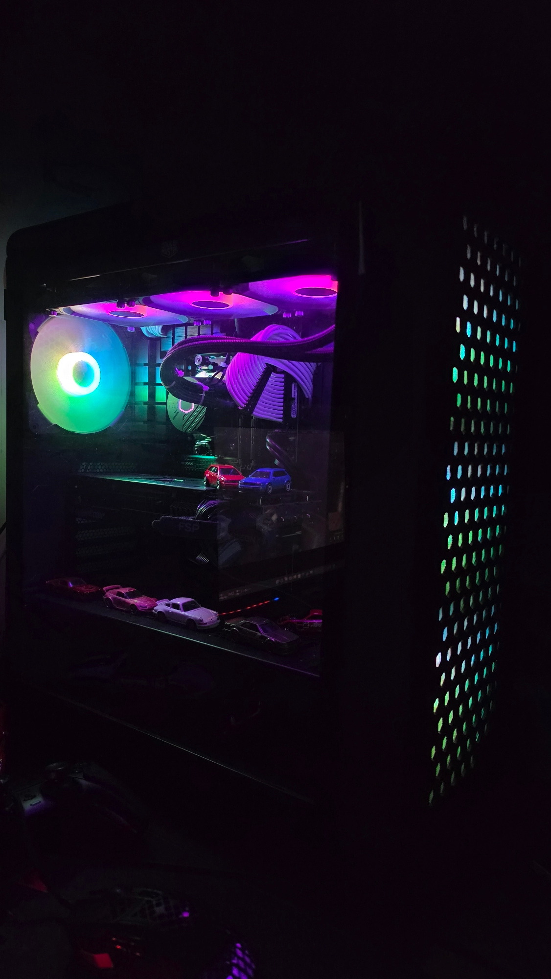 The image shows the inside of a computer tower with RGB lighting. The case is dark, with a perforated top panel allowing light to escape. Inside, there are multiple fans with RGB lighting in various cā¦read more