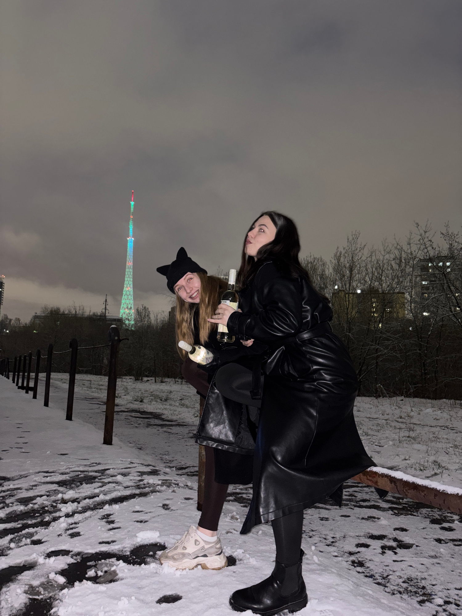 The image depicts two young women outdoors at night in a snowy, winter setting, possibly a park or pathways. The original image is rotated 90 degrees clockwise, but it is described as if correctly ori…read more