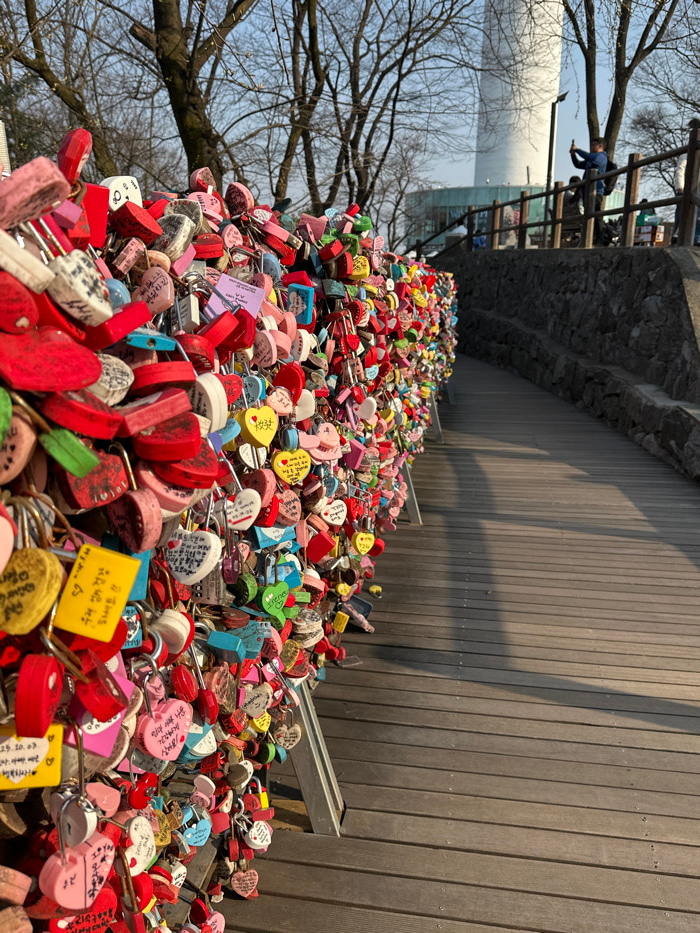 The image depicts an outdoor scene at the N Seoul Tower complex on Namsan Mountain, Seoul, South Korea. The foreground and mid-ground are dominated by a densely covered structure, acting as a barrier…read more