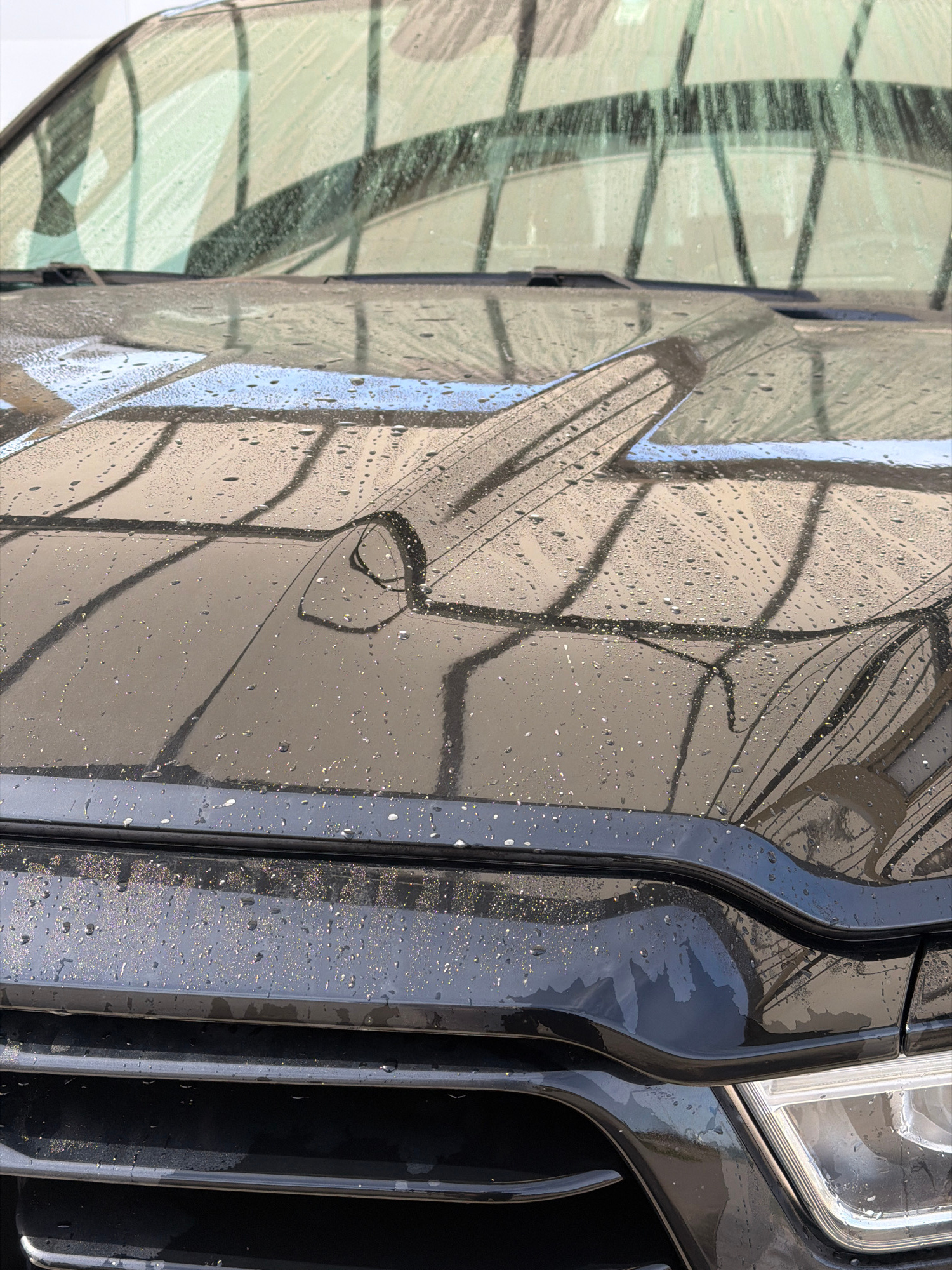 This close-up, angled photograph, taken in Bezborodovo, Russia, captures the side and front-right section of a dark-colored car, likely black or dark grey. The car's body panels and grille are covered…read more