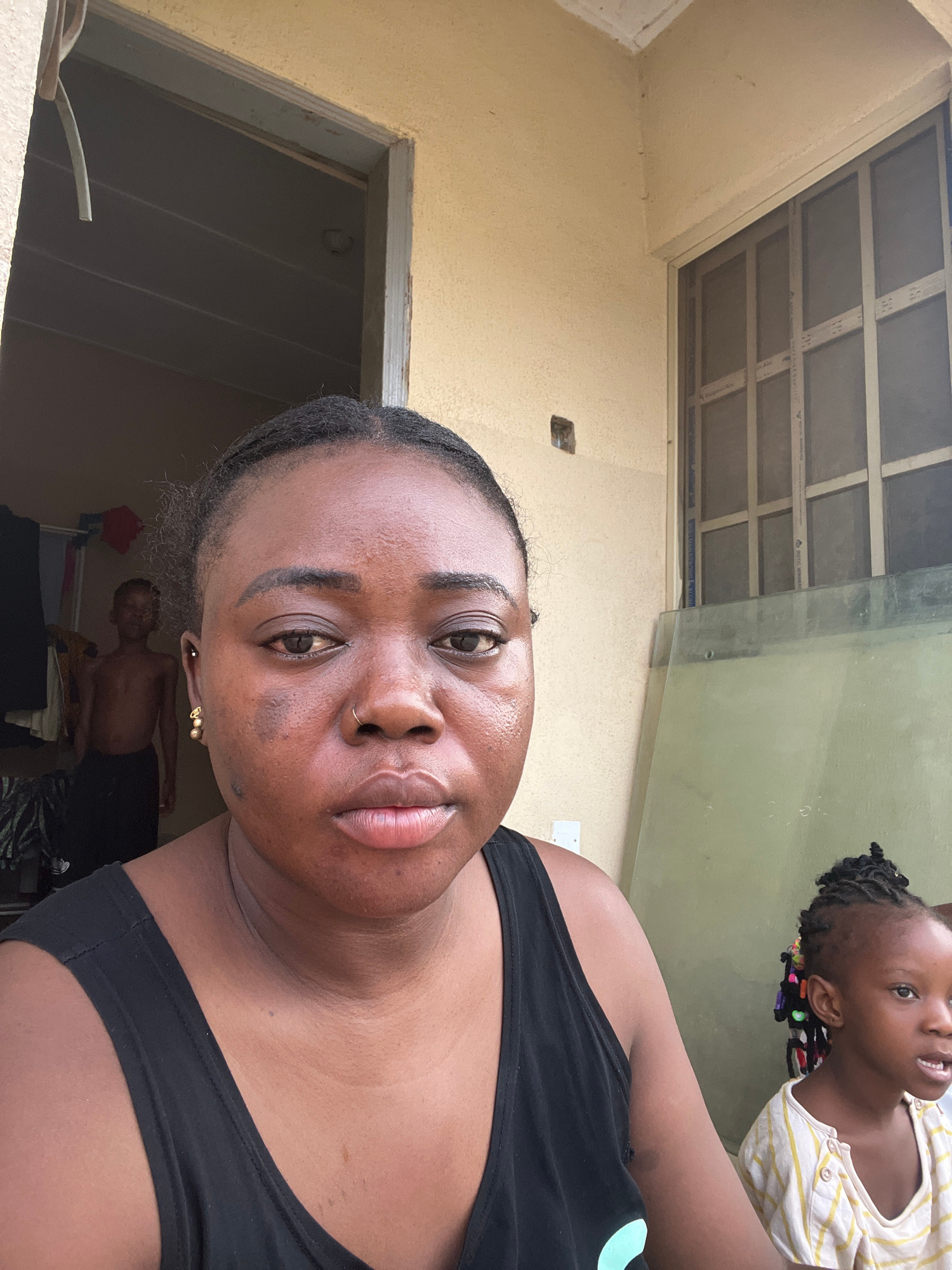 A woman with dark hair, wearing a black top, is pictured in a close-up selfie taken indoors. Behind her, a young girl with braided hair is partially visible near a window. In the background, through a…read more