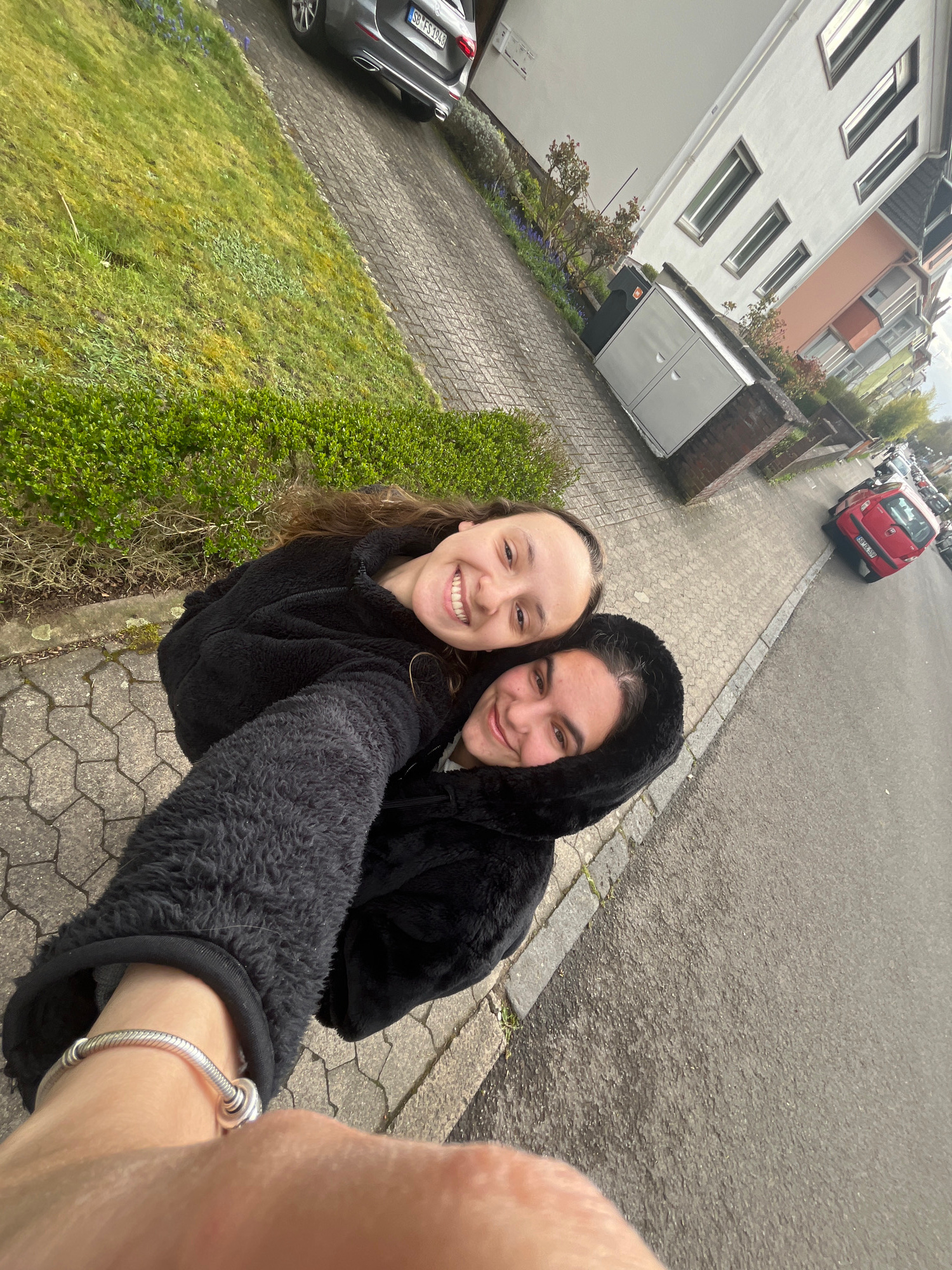 Two young women are posing for a selfie on a sidewalk in Saarbrücken, Germany. The woman on the left has shoulder-length curly hair and wears a black fleece jacket. The woman on the right is wearing a…read more