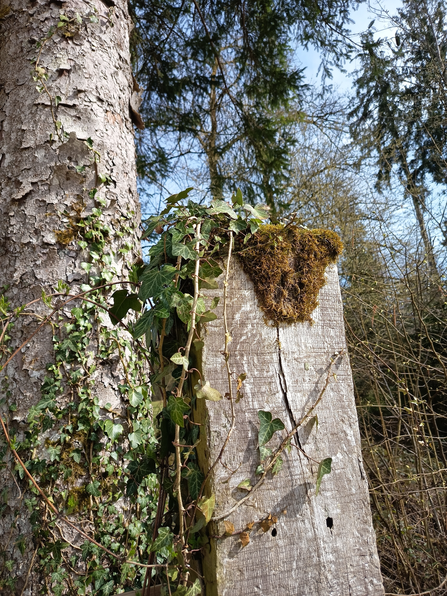 The image shows a tree trunk covered with ivy next to a weathered wooden post in an outdoor setting. The post is topped with a patch of moss. The sky is visible through the trees in the background. Th…read more
