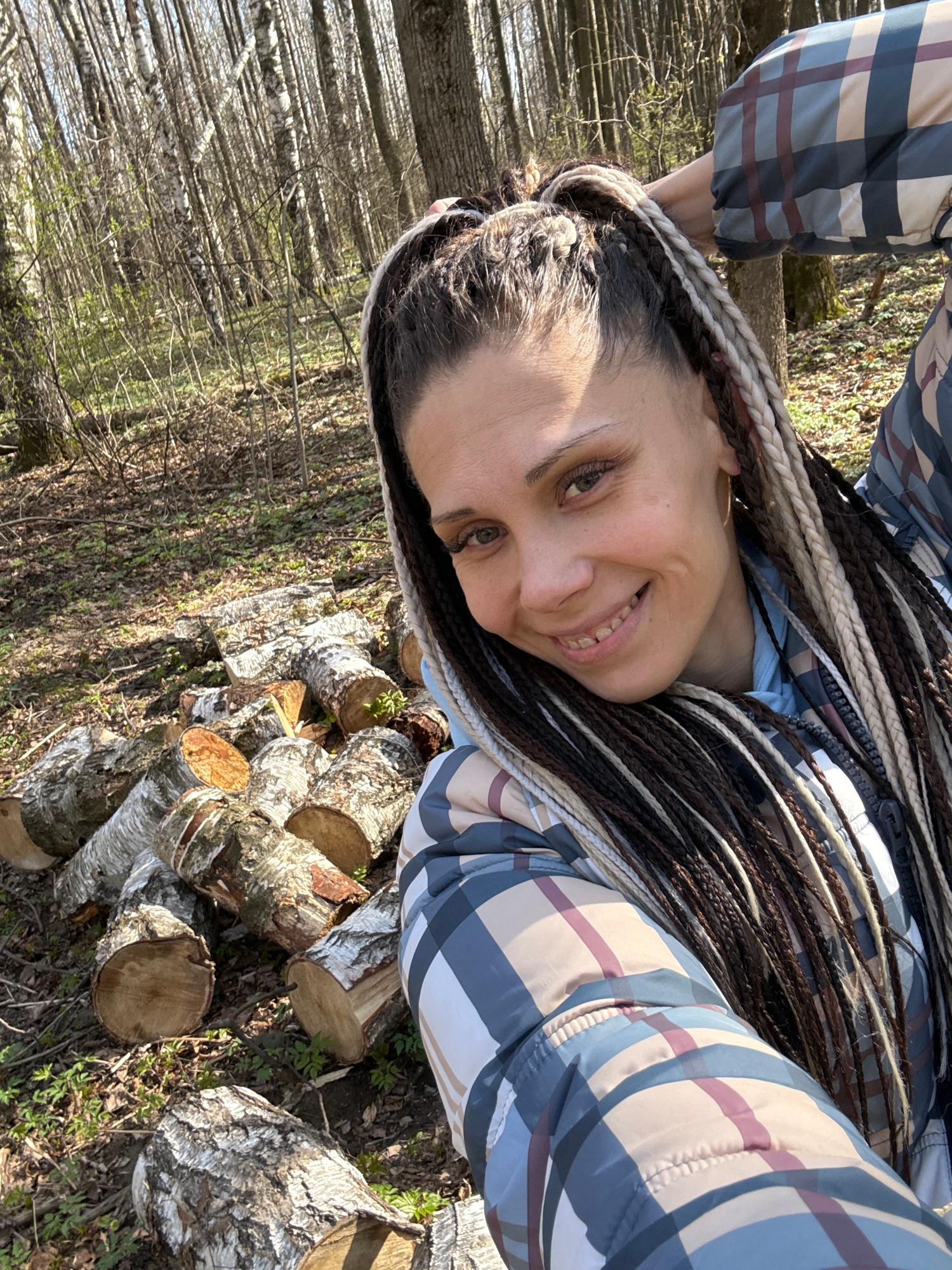 A medium close-up, eye-level selfie captures a woman smiling broadly at the camera, her head tilted to her right. She has long, dark and light-colored braided hair (dreadlocks or similar) that framesβ¦read more