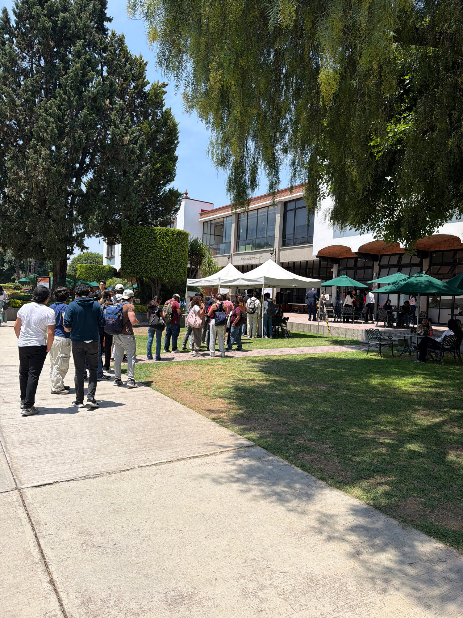 This outdoor scene, set in San Andrés Cholula, Mexico, captures a lively gathering on a sunny day. A crowd of people, predominantly young adults, are seen congregating and moving along a concrete path…read more