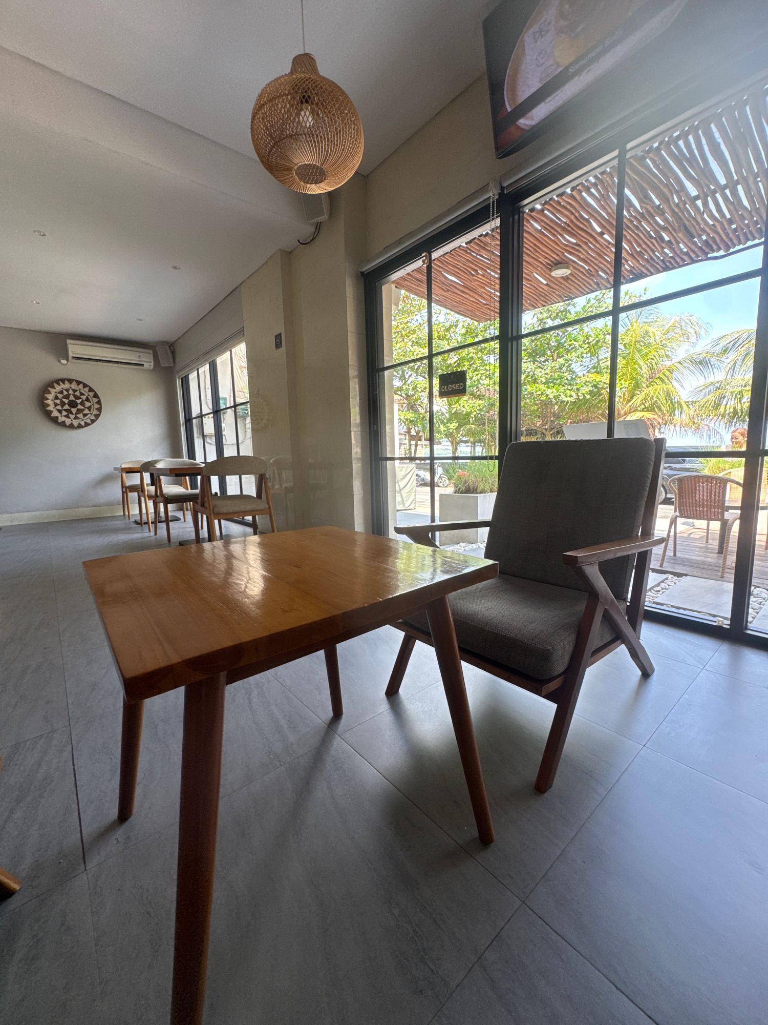 The image captures an interior scene of a cafe or restaurant, likely located in Kuta, Indonesia, given the tropical vegetation visible through the windows. The viewpoint is from within, looking toward…read more