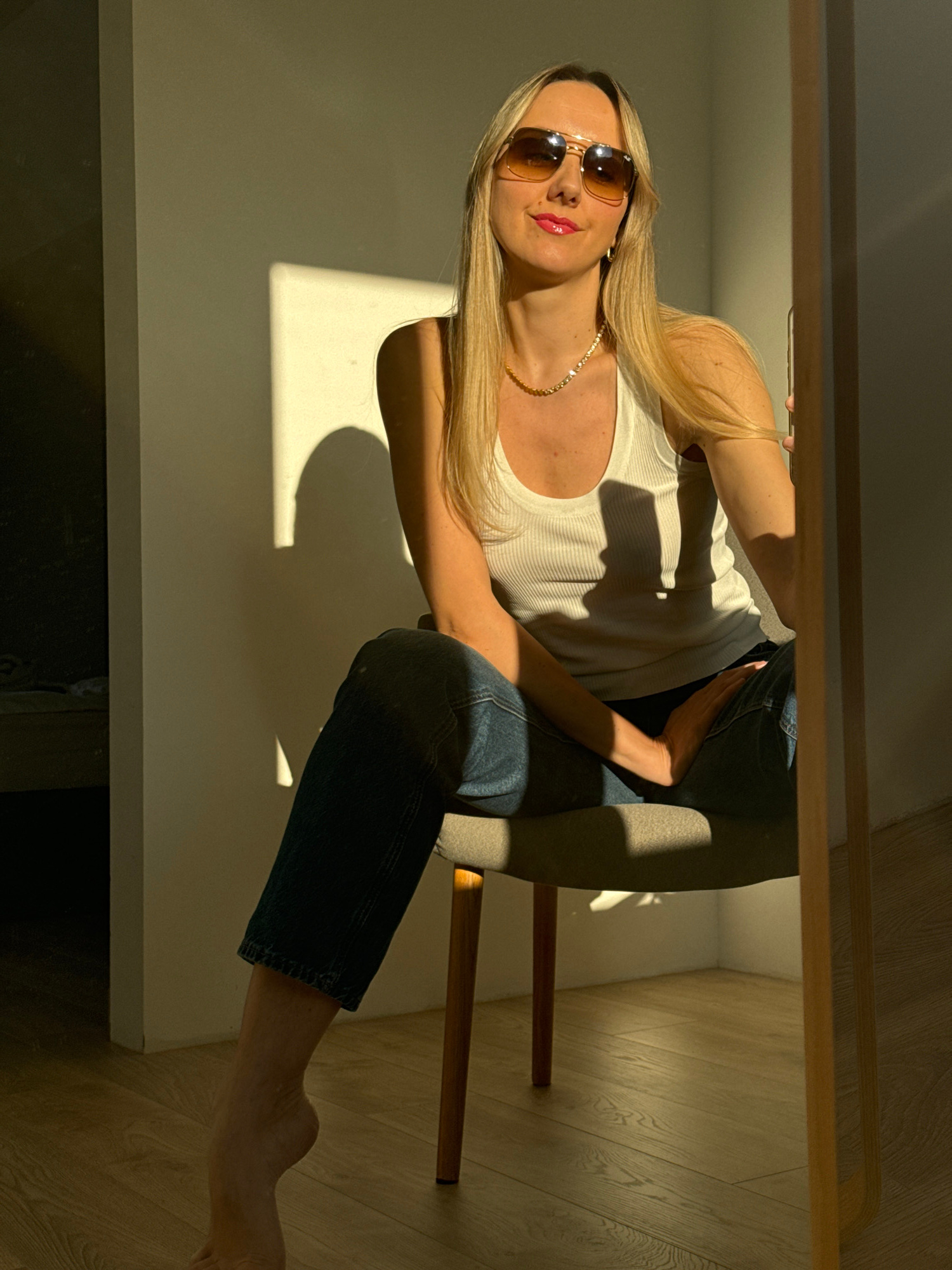 A blonde woman wearing sunglasses, a white tank top, blue jeans, and a gold chain sits on a chair in a room with hardwood floors and white walls. The woman is holding a phone and appears to be takingβ¦read more