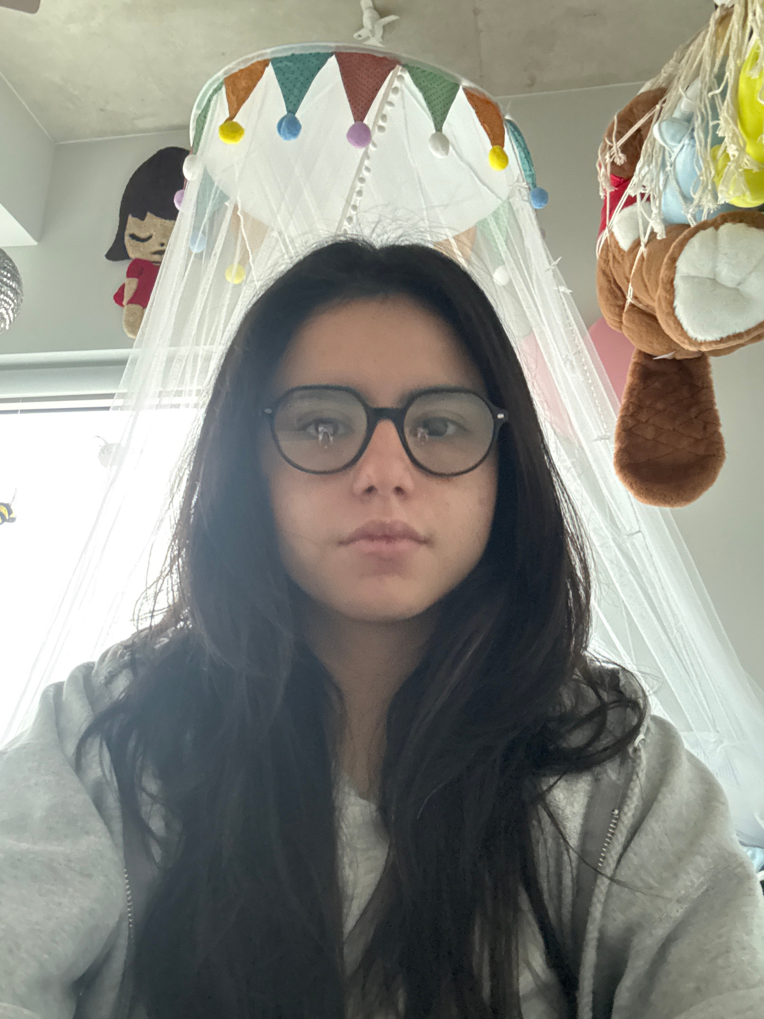 A person with dark hair and glasses is looking at the camera. They are wearing a gray hooded sweatshirt. Above them, there is a child's mobile and netting, with a teddy bear and fabric shapes visible.…read more