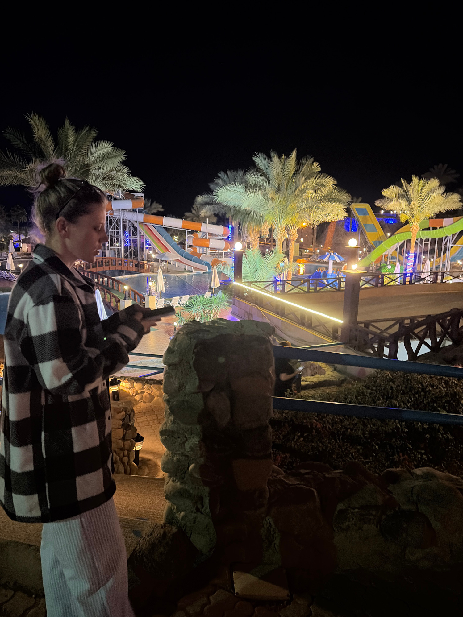 A photograph taken at night shows a woman standing in Sharm El Sheikh, Egypt, looking at the Sharm Park Fun Town water park. The woman is wearing a black and white plaid jacket. She has dark hair pull…read more