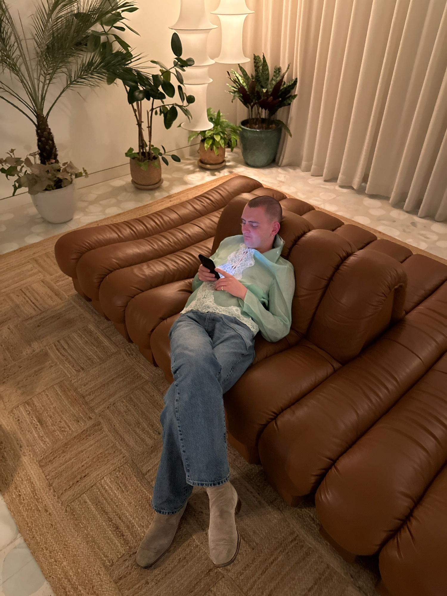 A fair-skinned person is lying on a brown leather sofa in what appears to be an interior space. They are holding a smartphone. They are wearing a light green blouse, denim jeans, and tan ankle boots.…read more