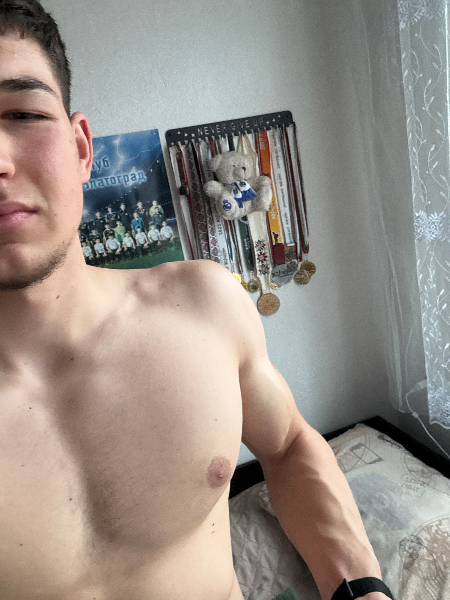 A close-up selfie captures a shirtless young man, visible from the mid-chest up, lying down and looking towards the camera with a neutral expression. His muscular right arm, chest, and a portion of hi…read more
