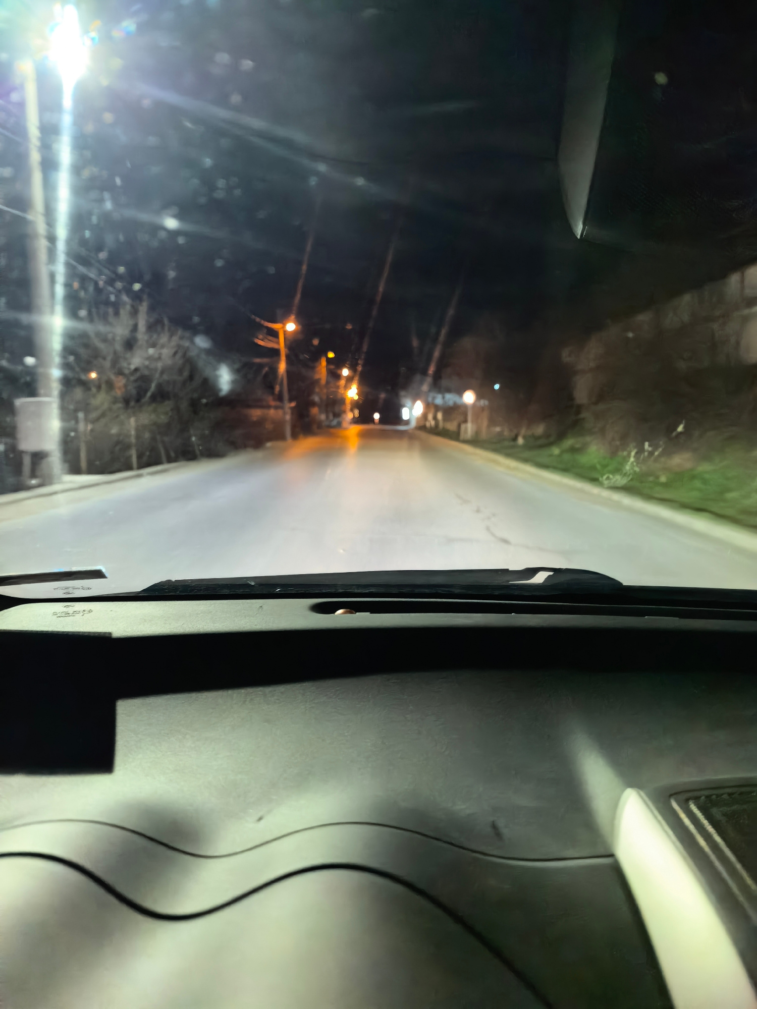 The image shows a nighttime street scene from inside a vehicle. The dashboard is visible in the foreground, with a road stretching into the distance. Streetlights illuminate the road, creating reflect…read more