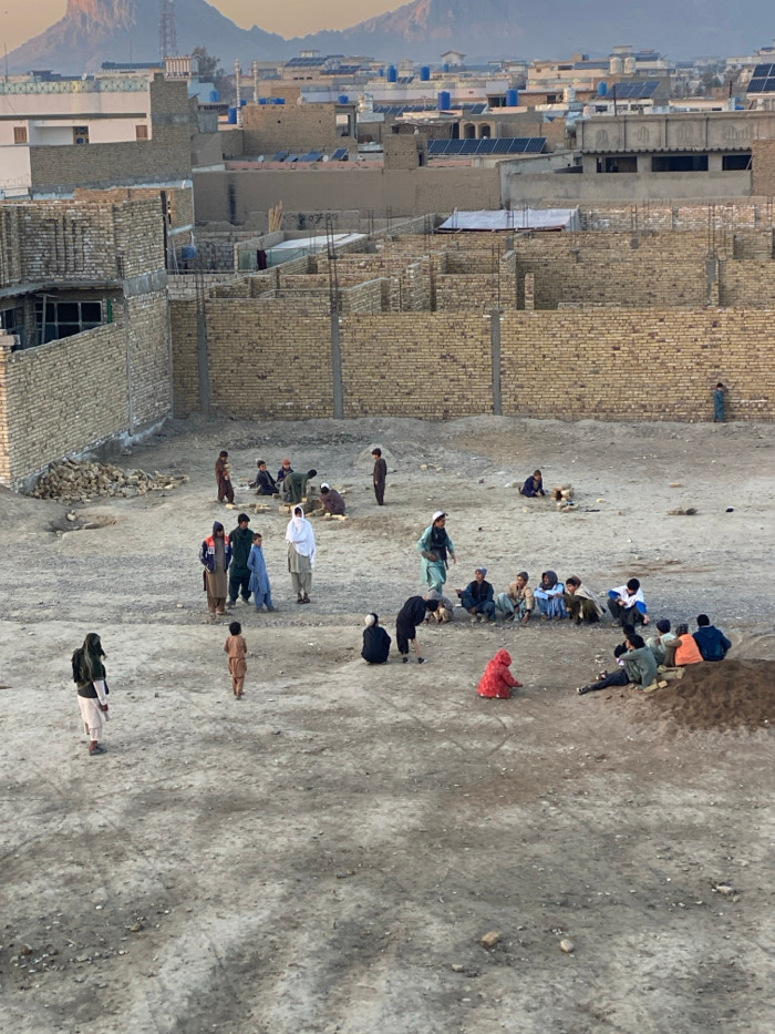 An aerial view depicts an unpaved, dusty open space in Kandahar, Afghanistan, surrounded by a dense urban environment with mountains on the horizon. The scene is illuminated by the low-angle, warm ligβ¦read more