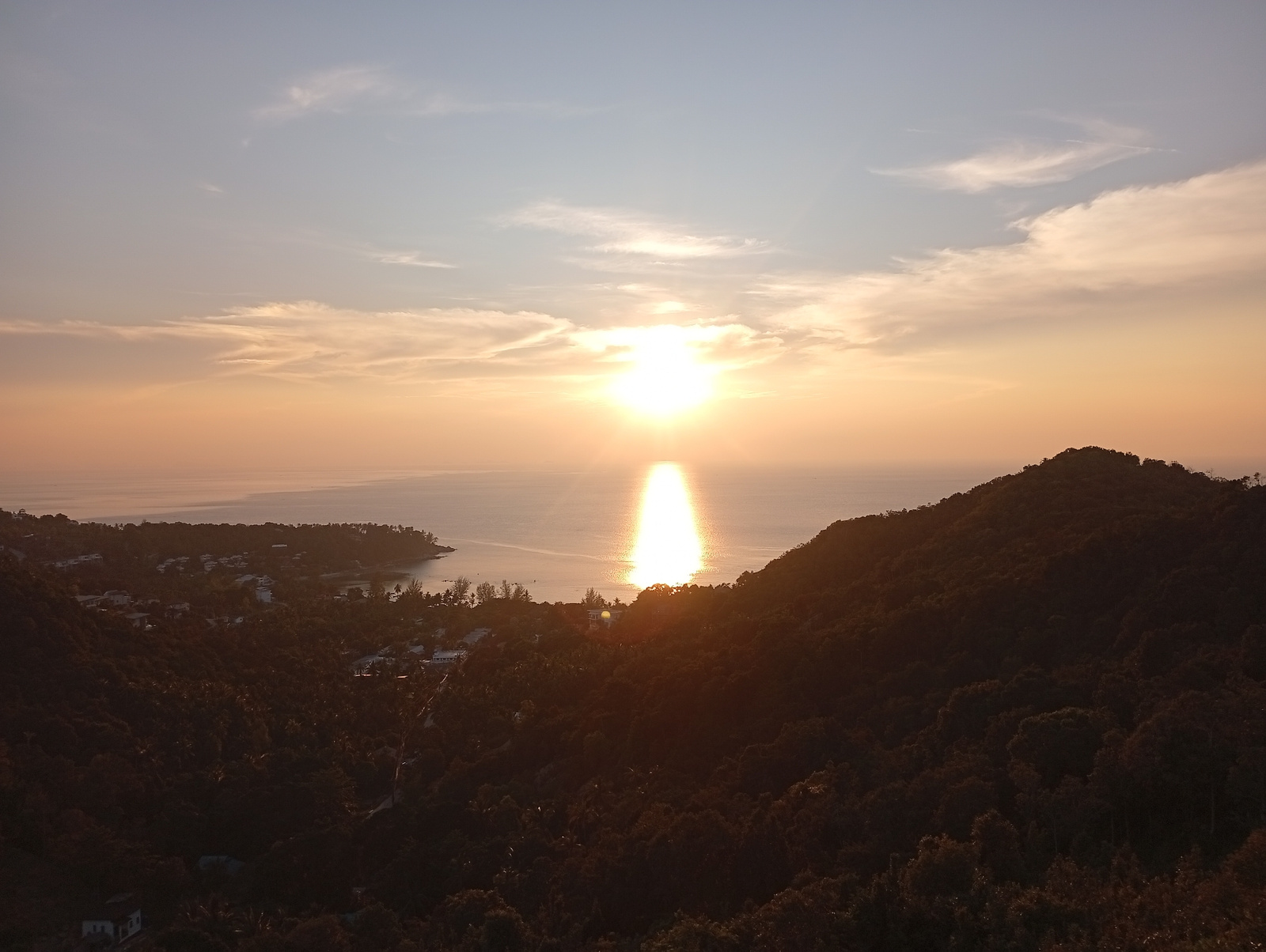 The media file presents a panoramic view of a tropical coastal landscape at sunset, likely captured from a high vantage point overlooking Baan Wang Ta Kien, Thailand. The central and most striking fe…read more