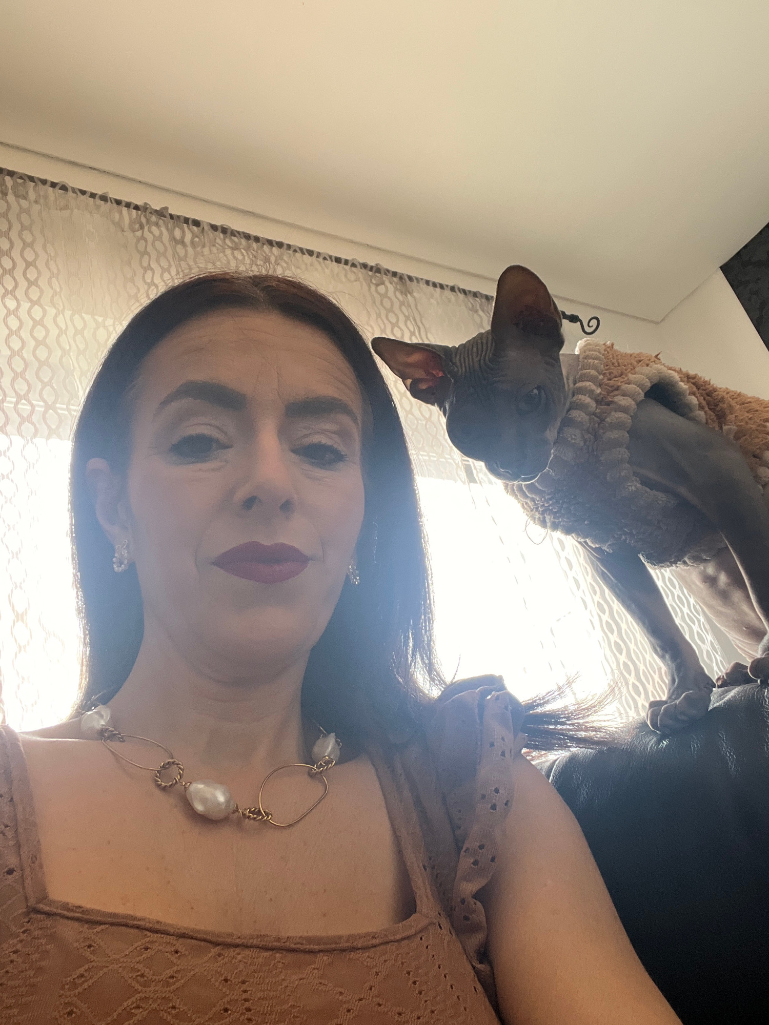 A woman is taking a selfie with a hairless cat in an indoor setting. The cat is wearing a beige textured garment. The woman is wearing a beige lace top and a pearl necklace. She has dark hair and is w…read more