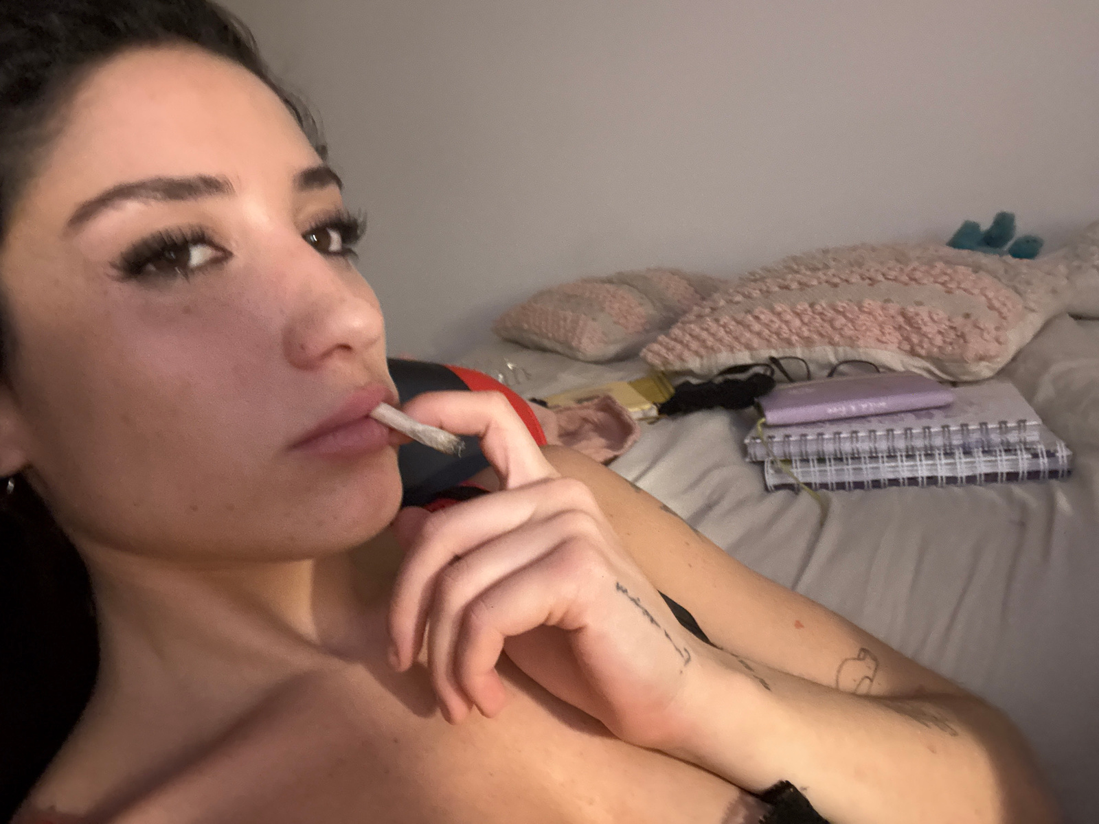 A woman with dark hair pulled back is lying on a bed. She has a cigarette in her mouth and her right hand is near her face. Her skin is fair with freckles. Tattoos are visible on her left forearm. The…read more