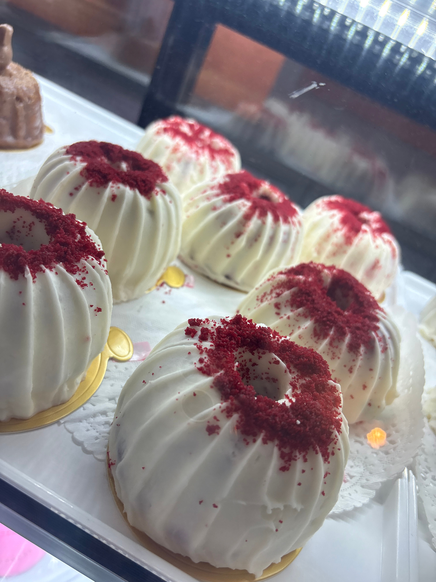 The image shows a display of red velvet bundt cakes in what appears to be a bakery or dessert shop. The cakes are arranged in rows on a tray, likely inside a refrigerated display case. Each cake is wh…read more