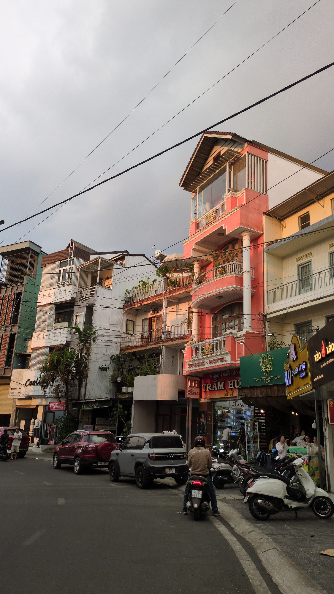 The image depicts a street scene in Da Lat, Vietnam. The street is lined with buildings of varying heights and architectural styles, some featuring balconies adorned with plants. Power lines are strun…read more