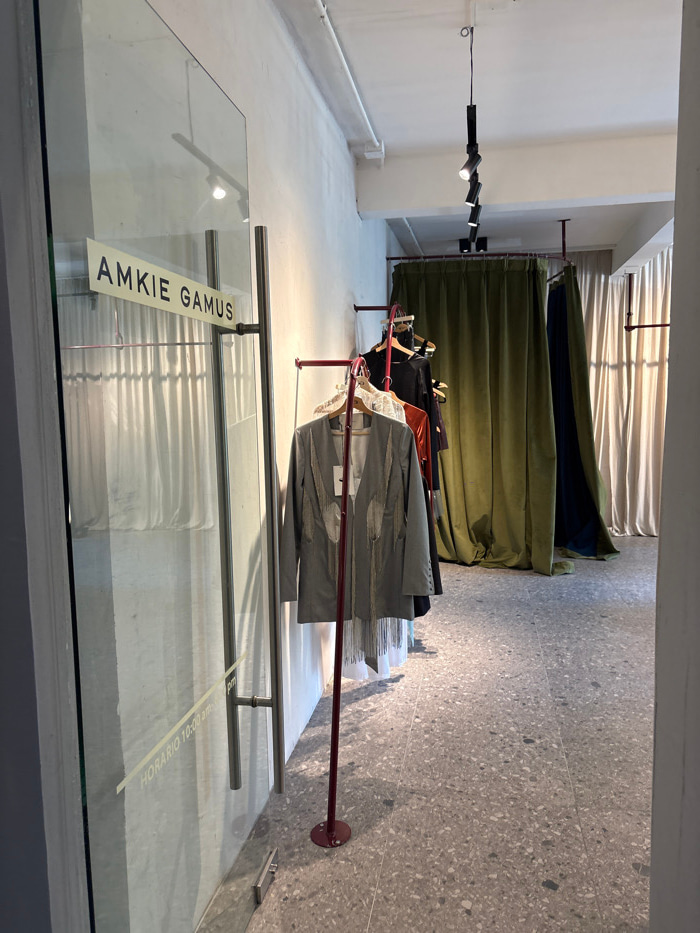 A store window showcases clothes on a red, curved rack. Gray blazers are at the front, followed by darker garments. Behind the rack, curtains of olive green and beige provide a backdrop. A glass panel…read more