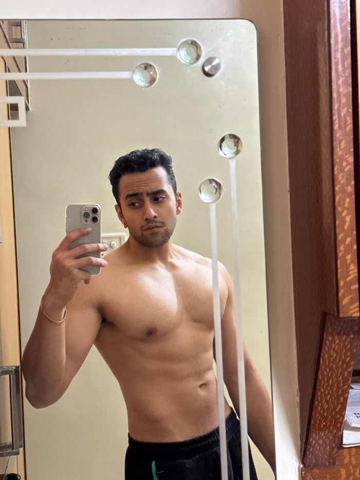 A man takes a mirror selfie. He has dark hair and a slight beard, holding a smartphone in his right hand. He's shirtless, revealing a toned physique. The mirror, adorned with decorative glass spheres…read more
