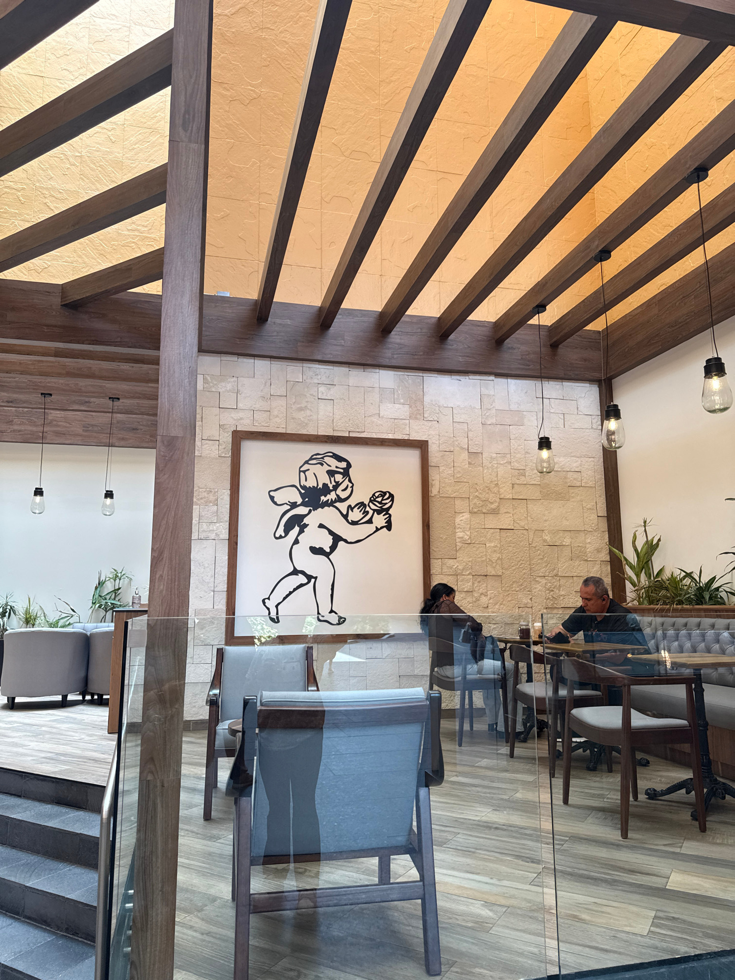 The image depicts an interior space with a modern design, possibly a restaurant or cafe. The location is presumed to be in Puebla, Mexico. **Environment:** * The walls are clad in a light-colored b…read more