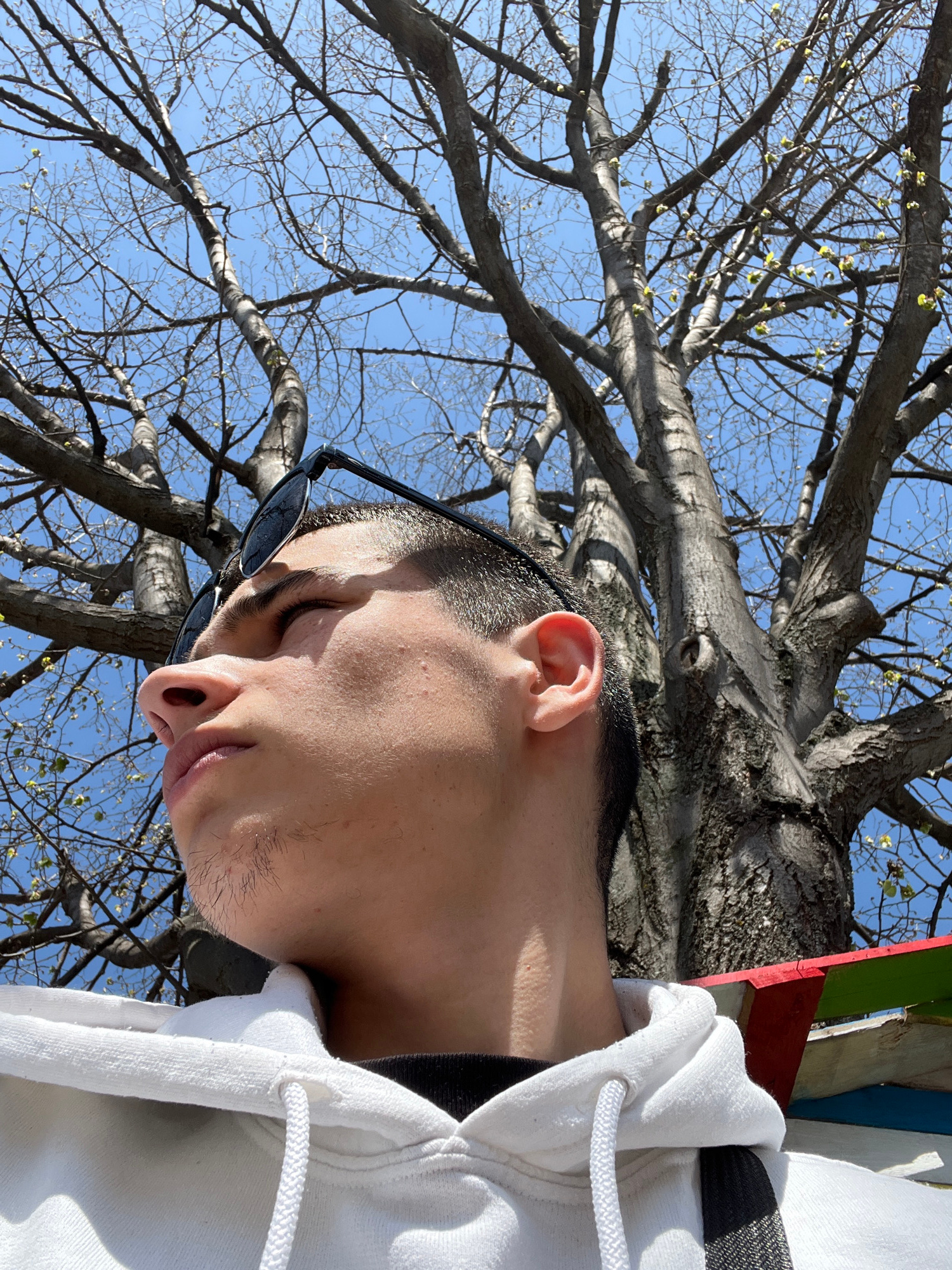A photograph, rotated 90 degrees clockwise, presents a unique worm's-eye view looking upwards at a young person and a tree against a clear sky. In the foreground, positioned in the lower portion of th…read more