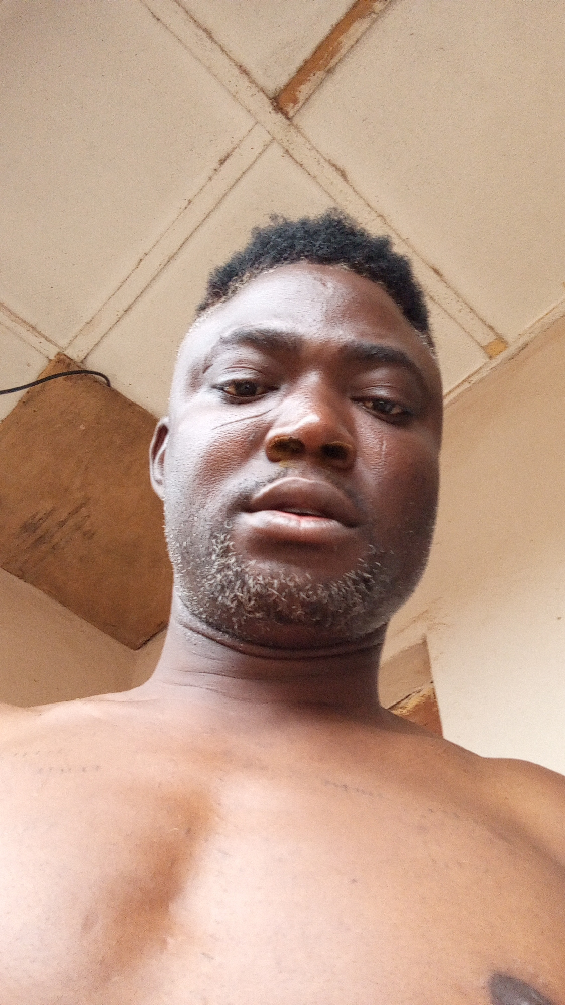A close-up, low-angle selfie of a dark-skinned man with short, dark hair and a patchy beard. He has scars on his face. He appears shirtless. The background shows a light-colored ceiling with wooden be…read more