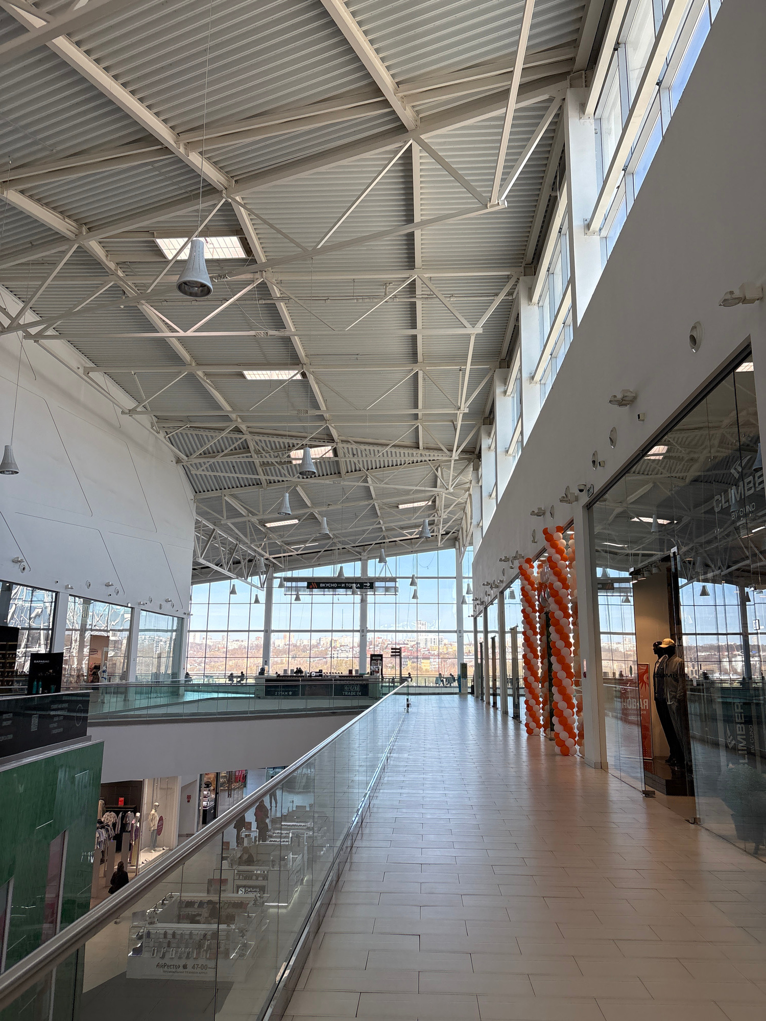 The image depicts the interior of the AQUAMALL shopping center in Ulyanovsk, Russia. The view looks lengthwise through the central corridor of the mall. The roof structure features a high, vaulted cei…read more