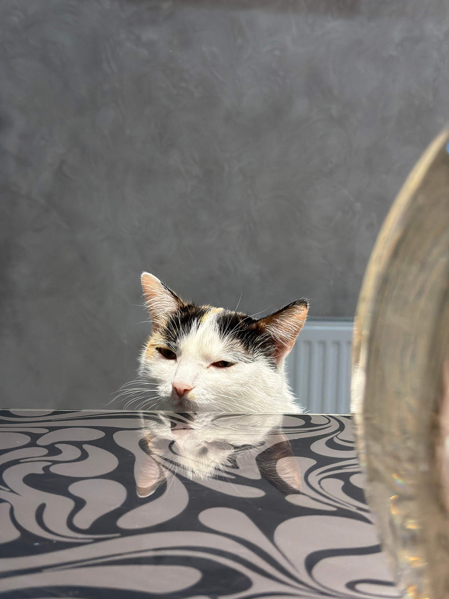 A cat with white, black, and tan fur is peeking over the edge of an object with a black and white wavy pattern. The background is a gray textured wall. The location is potentially Rossiyskiy, Russia.