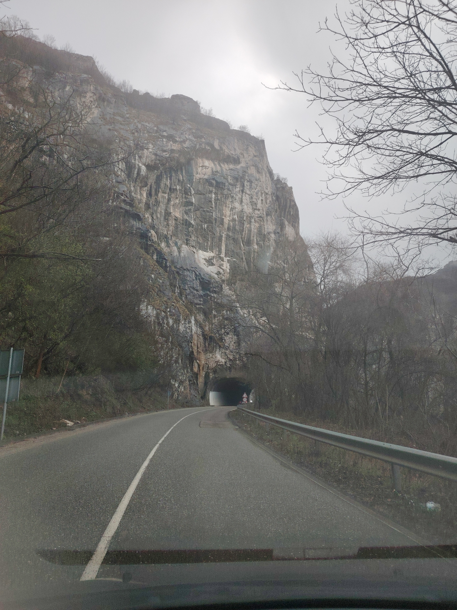 The image depicts a road leading towards a tunnel carved into a large rock face in Lyutibrod, Bulgaria. The sky is overcast. A two-lane road with a solid white line separating the lanes extends into t…read more