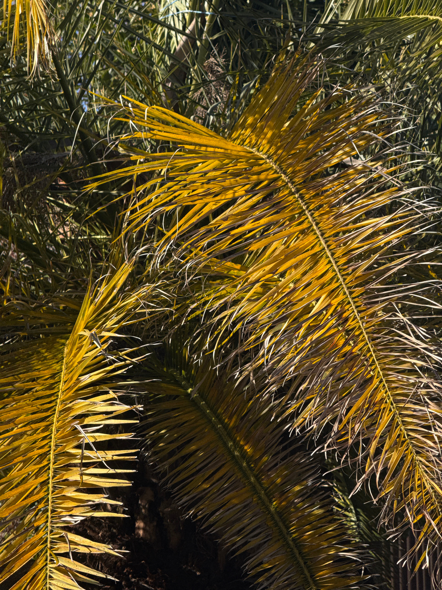 This close-up image captures a vibrant and textural view of several palm fronds. The primary subjects are the large, pinnate leaves of what appears to be a date palm or a similar species, densely pack…read more