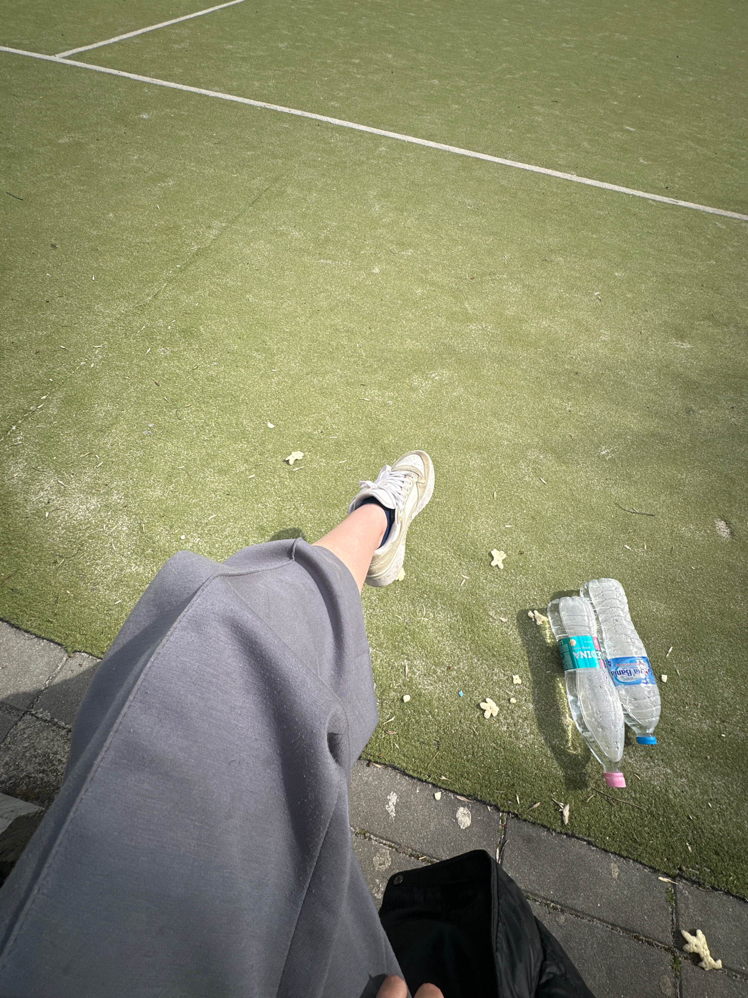 A medium-angle shot displays a person in the right frame wearing grey sweatpants and a white sneaker on their left foot. They are seated beside a synthetic green turf surface with white lines. Two pla…read more