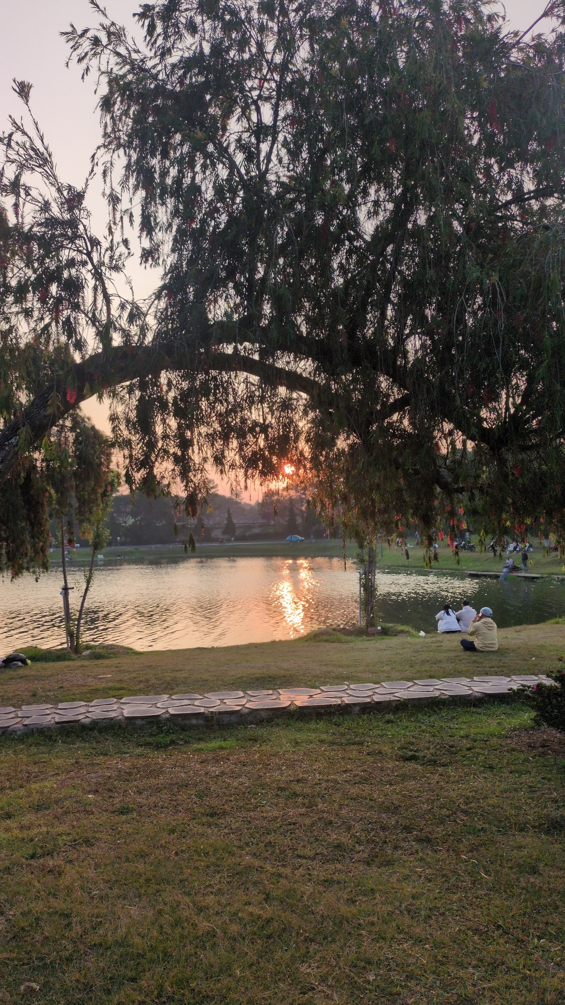 The scene captures a landscape at sunset in Da Lat, Vietnam. A tree with dense foliage dominates the left side, its branches partially obscuring the setting sun. The sun's rays reflect on a body of wa…read more