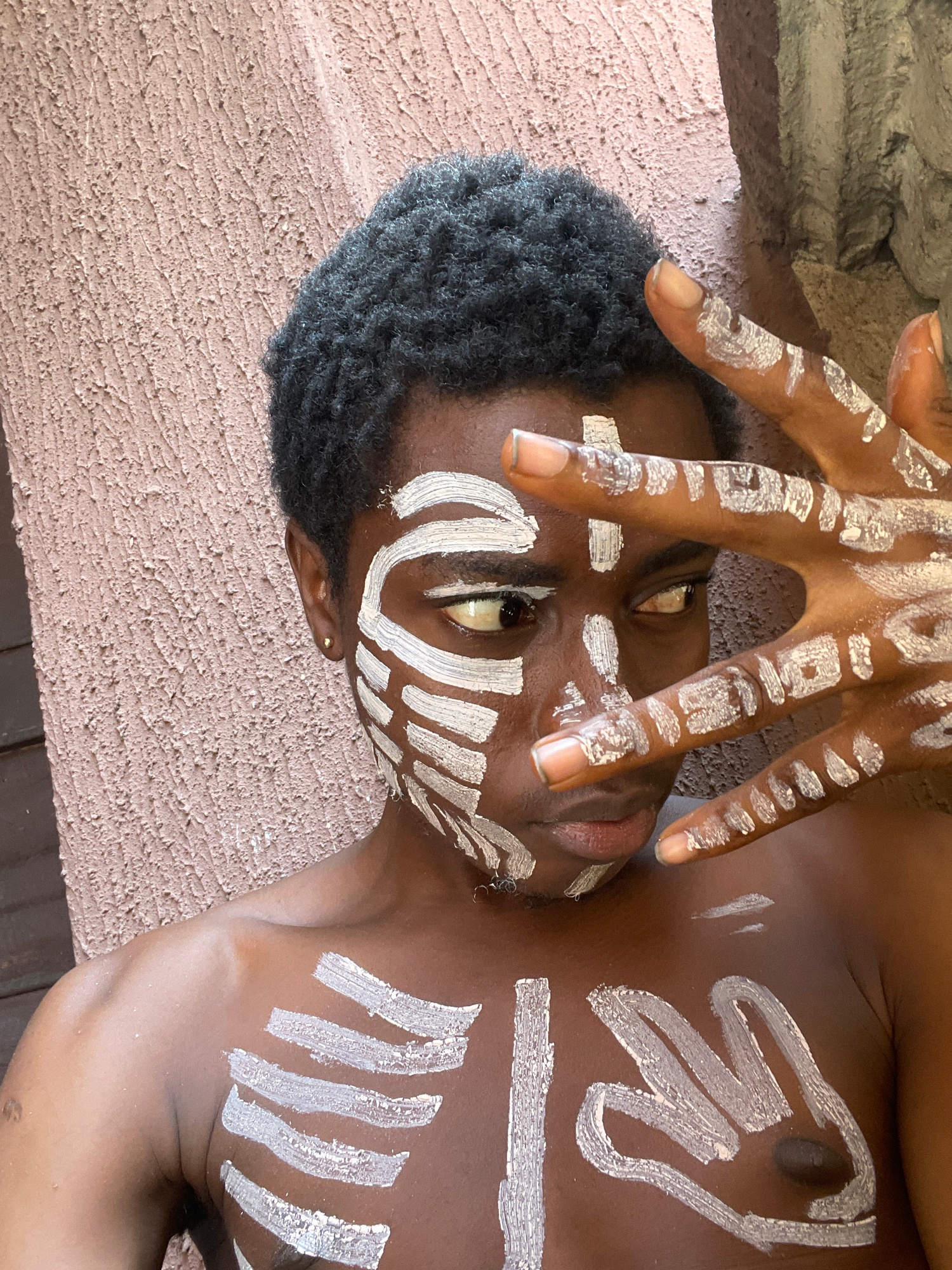 An individual with dark skin and dark, tightly curled hair is depicted lying down, with their head positioned towards the left of the frame and their body extending to the right. Their eyes are open a…read more
