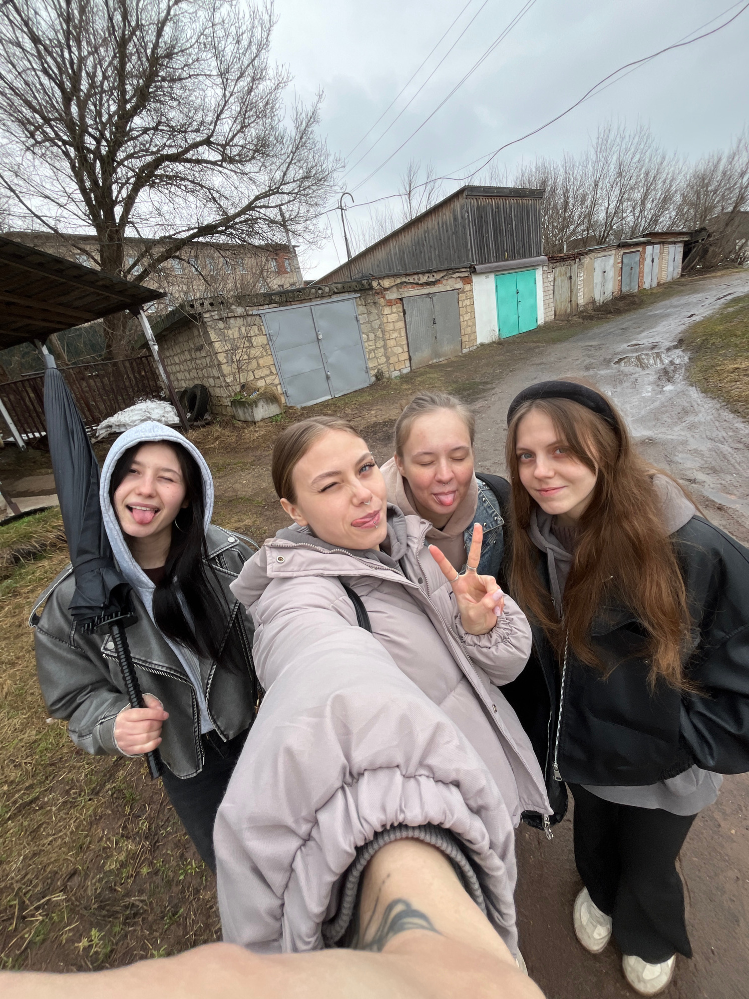 Four young women are posing for a selfie in an urban or semi-urban environment. The selfie taker's arm is visible on the right side of the frame, bearing a tattoo. The top of the head of one of the wo…read more
