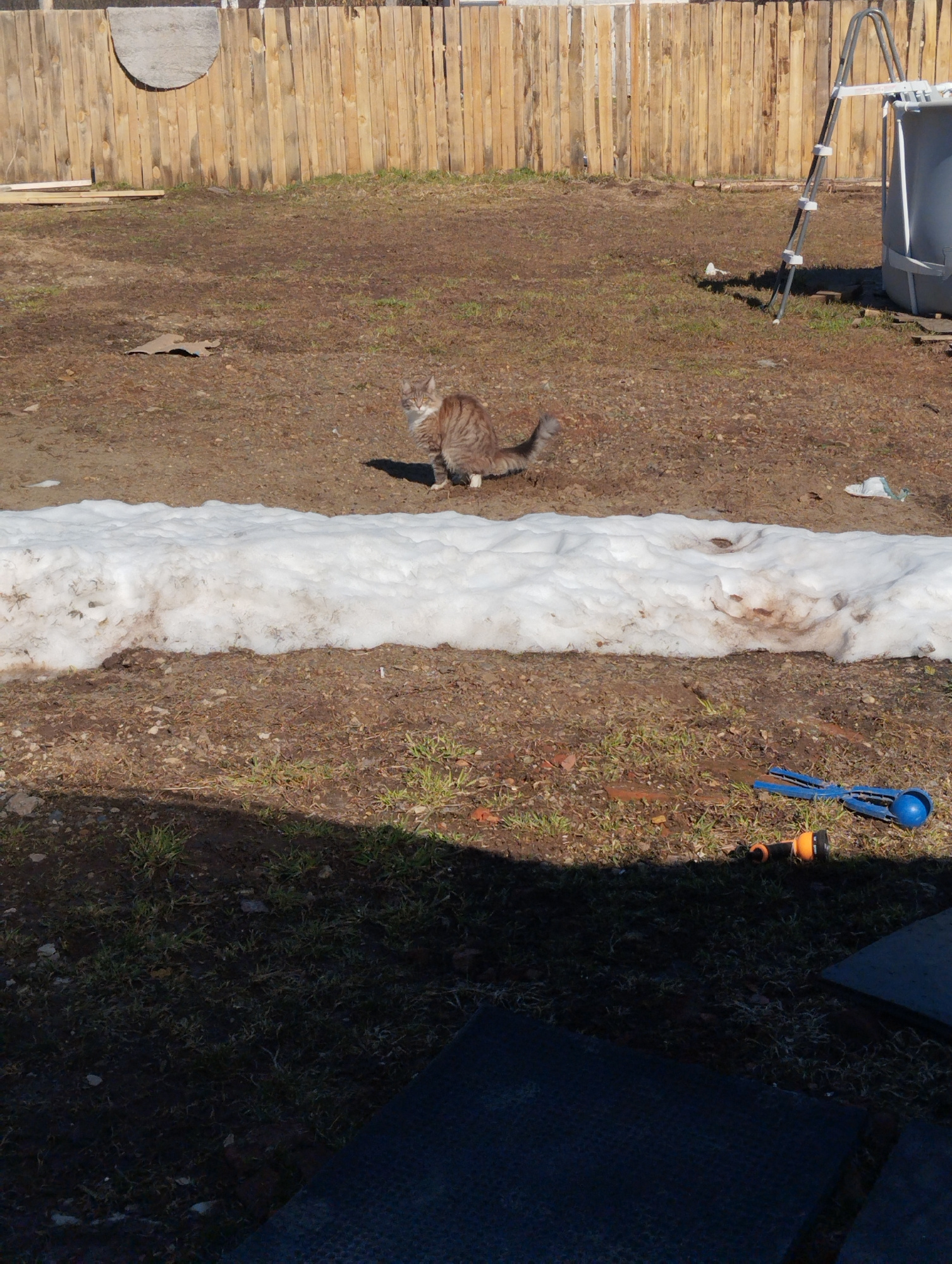 The image shows an outdoor scene in Grishanki, Russia. A patch of snow lies across the middle ground. A cat is standing on the dirt ground behind the snow patch, looking towards the camera. In the for…read more
