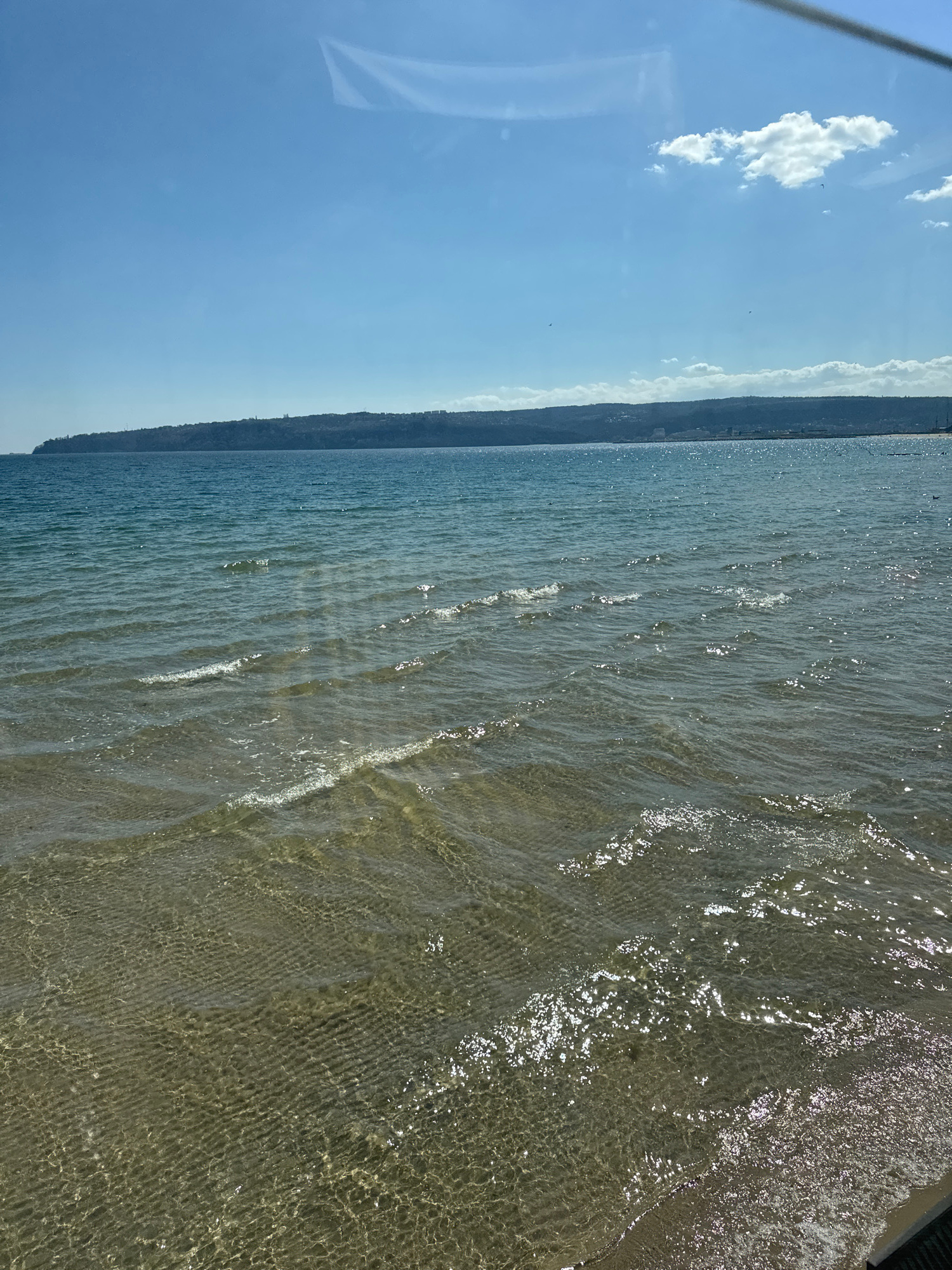 The image captures a view of the Black Sea from a high vantage point, likely near the city of Varna, Bulgaria. The sky is clear blue with scattered white clouds. Below, the sea stretches out, with vis…read more