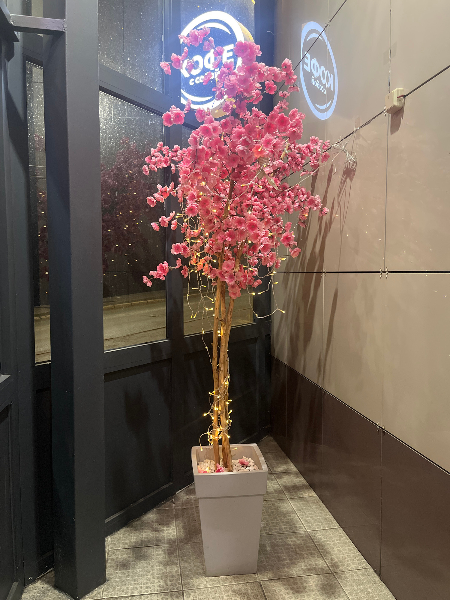 This image captures a decorative display within what appears to be the entrance or storefront of a commercial establishment, likely a coffee shop, in Izhevsk, Russia. The focal point is a vibrant arti…read more