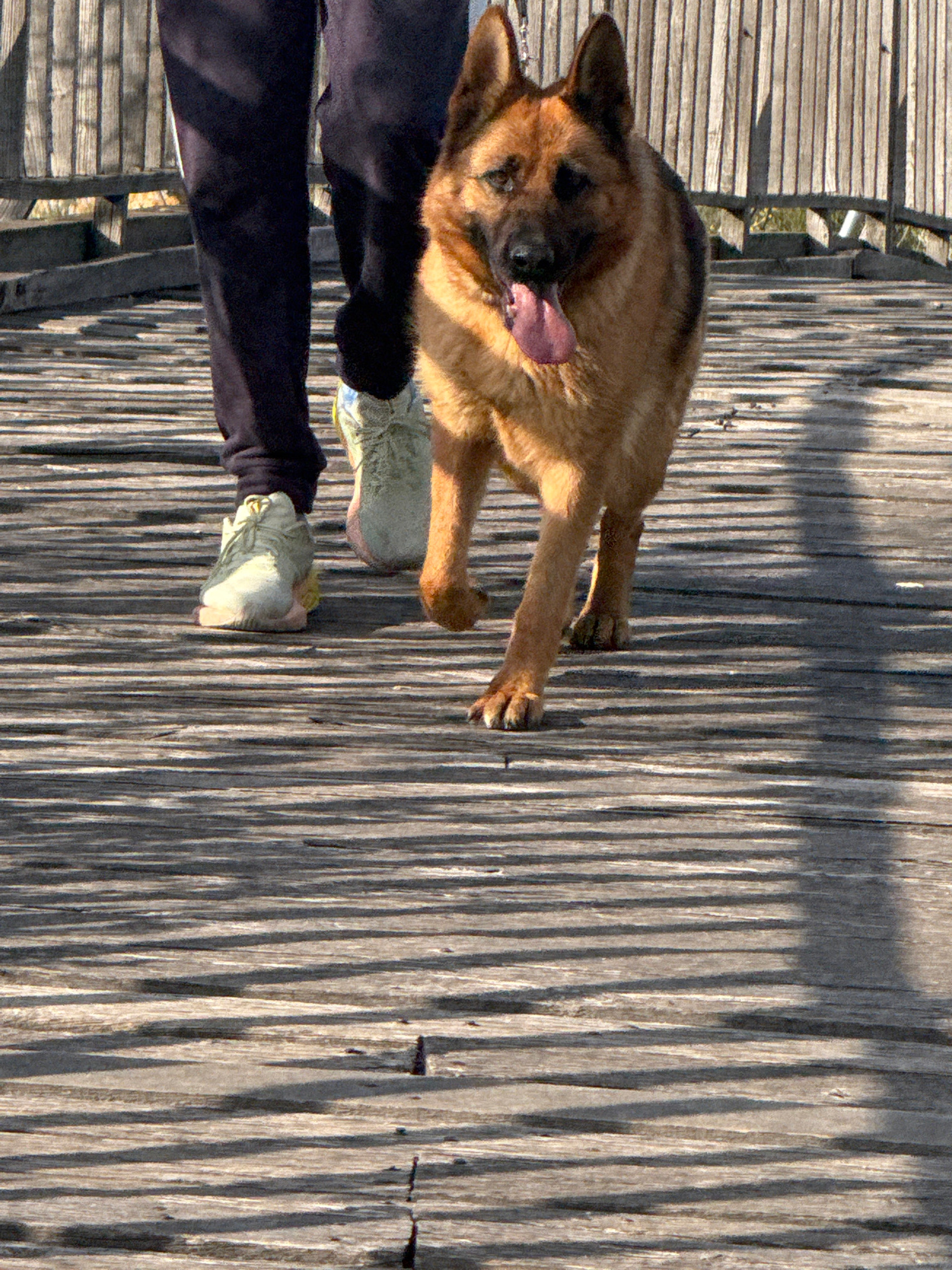 A medium shot depicts a person and a German Shepherd dog on a wooden surface, likely a boardwalk or bridge. The person is wearing dark pants and light-colored sneakers. The dog is in a mid-stride pose…read more