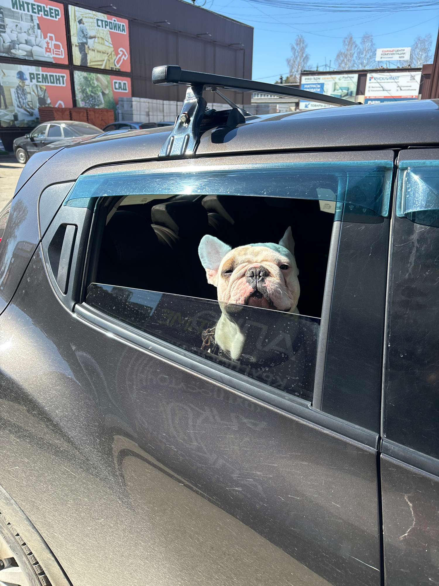 A light-colored bulldog is looking out of a partially open car window. The car is parked in front of a building with large advertisements in Russian, including the words "СТРОЙКА", "САД", "ИНТЕРЬЕР",…read more